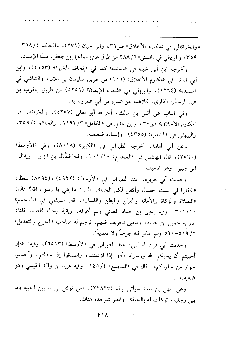 وحديث أبي هريرة، عند الطبراني في "الأوسط" (٤٩٢٢) و (٨٥٩٤) بلفظ: "اكفلوا لي بست خصال وأكفل لكم الجنة". قلت: ما هي يا رسول الله؟ قال: "الصلاة والزكاة والأمانة والفرْج والبطن واللسان". قال الهيثمي في "المجمع" ١٠/٣٠١: وفيه يحيى بن حماد الطائي ولم أعرفه، وبقية رجاله ثقات. قلنا: صوابه جميل بن حماد، ويحيى تحريف قديم، ترجم له صاحب "الجرح والتعديل" ٢/٥١٩-٥٢٠ ولم يذكر فيه جرحاً ولا تعديلاً.