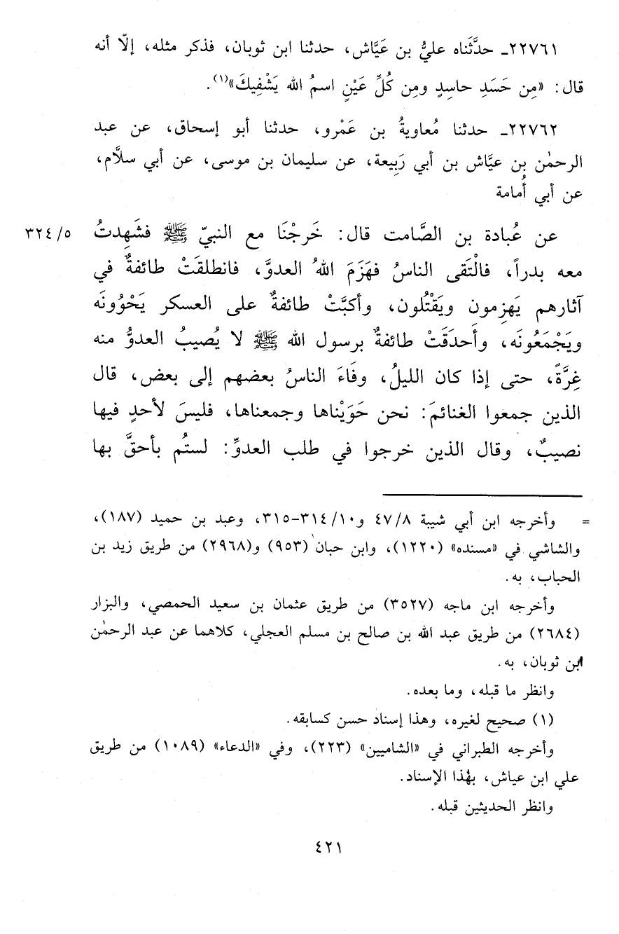٢٢٧٦٢ - حَدَّثَنَا مُعَاوِيَةُ بْنُ عَمْرٍو، حَدَّثَنَا أَبُو إِسْحَاقَ، عَنْ عَبْدِ الرَّحْمَنِ بْنِ عَيَّاشِ بْنِ أَبِي رَبِيعَةَ، عَنْ سُلَيْمَانَ بْنِ مُوسَى، عَنْ أَبِي سَلَّامٍ، عَنْ أَبِي أُمَامَةَ، عَنْ عُبَادَةَ بْنِ الصَّامِتِ قَالَ: خَرَجْنَا مَعَ النَّبِيِّ صَلَّى اللهُ عَلَيْهِ وَسَلَّمَ فَشَهِدْتُ مَعَهُ بَدْرًا، فَالْتَقَى النَّاسُ فَهَزَمَ اللهُ الْعَدُوَّ، فَانْطَلَقَتْ طَائِفَةٌ فِي آثَارِهِمْ يَهْزِمُونَ وَيَقْتُلُونَ، وَأَكَبَّتْ طَائِفَةٌ عَلَى الْعَسْكَرِ يَحْوُونَهُ وَيَجْمَعُونَهُ، وَأَحْدَقَتْ طَائِفَةٌ بِرَسُولِ اللهِ صَلَّى اللهُ عَلَيْهِ وَسَلَّمَ لَا يُصِيبُ الْعَدُوُّ مِنْهُ غِرَّةً حَتَّى إِذَا كَانَ اللَّيْلُ، وَفَاءَ النَّاسُ بَعْضُهُمْ إِلَى بَعْضٍ قَالَ الَّذِينَ جَمَعُوا الْغَنَائِمَ: نَحْنُ حَوَيْنَاهَا وَجَمَعْنَاهَا فَلَيْسَ لِأَحَدٍ فِيهَا نَصِيبٌ. وَقَالَ الَّذِينَ خَرَجُوا فِي طَلَبِ الْعَدُوِّ: لَسْتُمْ بِأَحَقَّ بِهَا