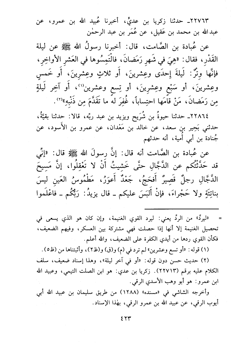 ٢٢٧٦٣ - حَدَّثَنَا زَكَرِيَّا بْنُ عَدِيٍّ، أَخْبَرَنَا عُبَيْدُ اللهِ بْنُ عَمْرٍو، عَنْ عَبْدِ اللهِ بْنِ مُحَمَّدِ بْنِ عَقِيلٍ، عَنْ عُمَرَ بْنِ عَبْدِ الرَّحْمَنِ، عَنْ عُبَادَةَ بْنِ الصَّامِتِ قَالَ: أَخْبَرَنَا رَسُولُ اللهِ صَلَّى اللهُ عَلَيْهِ وَسَلَّمَ عَنْ لَيْلَةِ الْقَدْرِ فَقَالَ: " هِيَ فِي شَهْرِ رَمَضَانَ فَالْتَمِسُوهَا فِي الْعَشْرِ الْأَوَاخِرِ؛ فَإِنَّهَا وَتْرٌ: لَيْلَةِ إِحْدَى وَعِشْرِينَ، أَوْ ثَلَاثٍ وَعِشْرِينَ، أَوْ خَمْسٍ وَعِشْرِينَ، أَوْ سَبْعٍ وَعِشْرِينَ، أَوْ تِسْعٍ وَعِشْرِينَ (١) أَوْ آخِرِ لَيْلَةٍ مِنْ رَمَضَانَ. مَنْ قَامَهَا احْتِسَابًا غُفِرَ لَهُ مَا تَقَدَّمَ مِنْ ذَنْبِهِ " (٢)