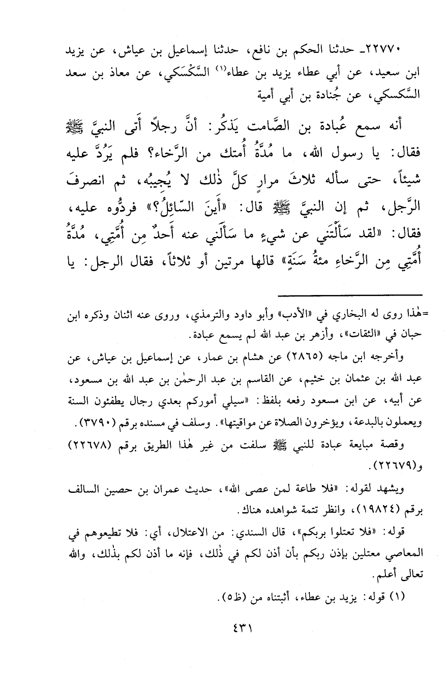 ٢٢٧٧٠ - حَدَّثَنَا الْحَكَمُ بْنُ نَافِعٍ، حَدَّثَنَا إِسْمَاعِيلُ بْنُ عَيَّاشٍ، عَنْ يَزِيدَ بْنِ سَعِيدٍ، عَنْ أَبِي عَطَاءٍ يَزِيدَ بْنِ عَطَاءٍ (١) السَّكْسَكِيِّ، عَنْ مُعَاذِ بْنِ سَعْدٍ السَّكْسَكِيِّ، عَنْ جُنَادَةَ بْنِ أَبِي أُمَيَّةَ أَنَّهُ: سَمِعَ عُبَادَةَ بْنَ الصَّامِتِ يَذْكُرُ، أَنَّ رَجُلًا أَتَى النَّبِيَّ صَلَّى اللهُ عَلَيْهِ وَسَلَّمَ فَقَالَ: يَا رَسُولَ اللهِ، مَا مُدَّةُ أُمَّتِكَ مِنَ الرَّخَاءِ؟ فَلَمْ يَرُدَّ عَلَيْهِ شَيْئًا حَتَّى سَأَلَهُ ثَلَاثَ مِرَارٍ كُلُّ ذَلِكَ لَا يُجِيبُهُ، ثُمَّ انْصَرَفَ الرَّجُلُ، ثُمَّ إِنَّ النَّبِيَّ صَلَّى اللهُ عَلَيْهِ وَسَلَّمَ قَالَ: " أَيْنَ السَّائِلُ؟ " فَرَدُّوهُ عَلَيْهِ، فَقَالَ: " لَقَدْ سَأَلْتَنِي عَنْ شَيْءٍ مَا سَأَلَنِي عَنْهُ أَحَدٌ مِنْ أُمَّتِي، مُدَّةُ أُمَّتِي مِنَ الرَّخَاءِ مِائَةُ سَنَةٍ "، قَالَهَا مَرَّتَيْنِ أَوْ ثَلَاثًا، فَقَالَ الرَّجُلُ: يَا
