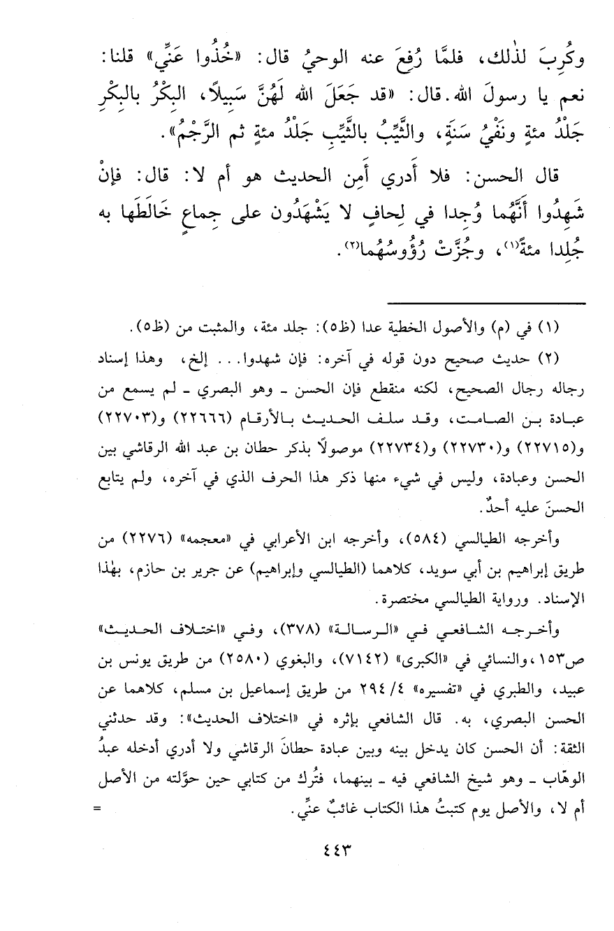 وأخرجه الشافعي في "الرسالة" (٣٧٨) ، وفي "اختلاف الحديث" ص ١٥٣، والنسائي في "الكبرى" (٧١٤٢) ، والبغوي (٢٥٨٠) من طريق يونس بن عبيد، والطبري في "تفسيره" ٤/٢٩٤ من طريق إسماعيل بن مسلم، كلاهما عن الحسن البصري، به. قال الشافعي بإثره في "اختلاف الحديث": وقد حدثني الثقة: أن الحسن كان يدخل بينه وبين عبادة حطانَ الرقاشي ولا أدري أدخله عبدُ الوهّاب -وهو شيخ الشافعي فيه- بينهما، فتُرك من كتابي حين حوَّلته من الأصل أم لا، والأصل يوم كتبتُ هذا الكتاب غائبٌ عنِّي. =