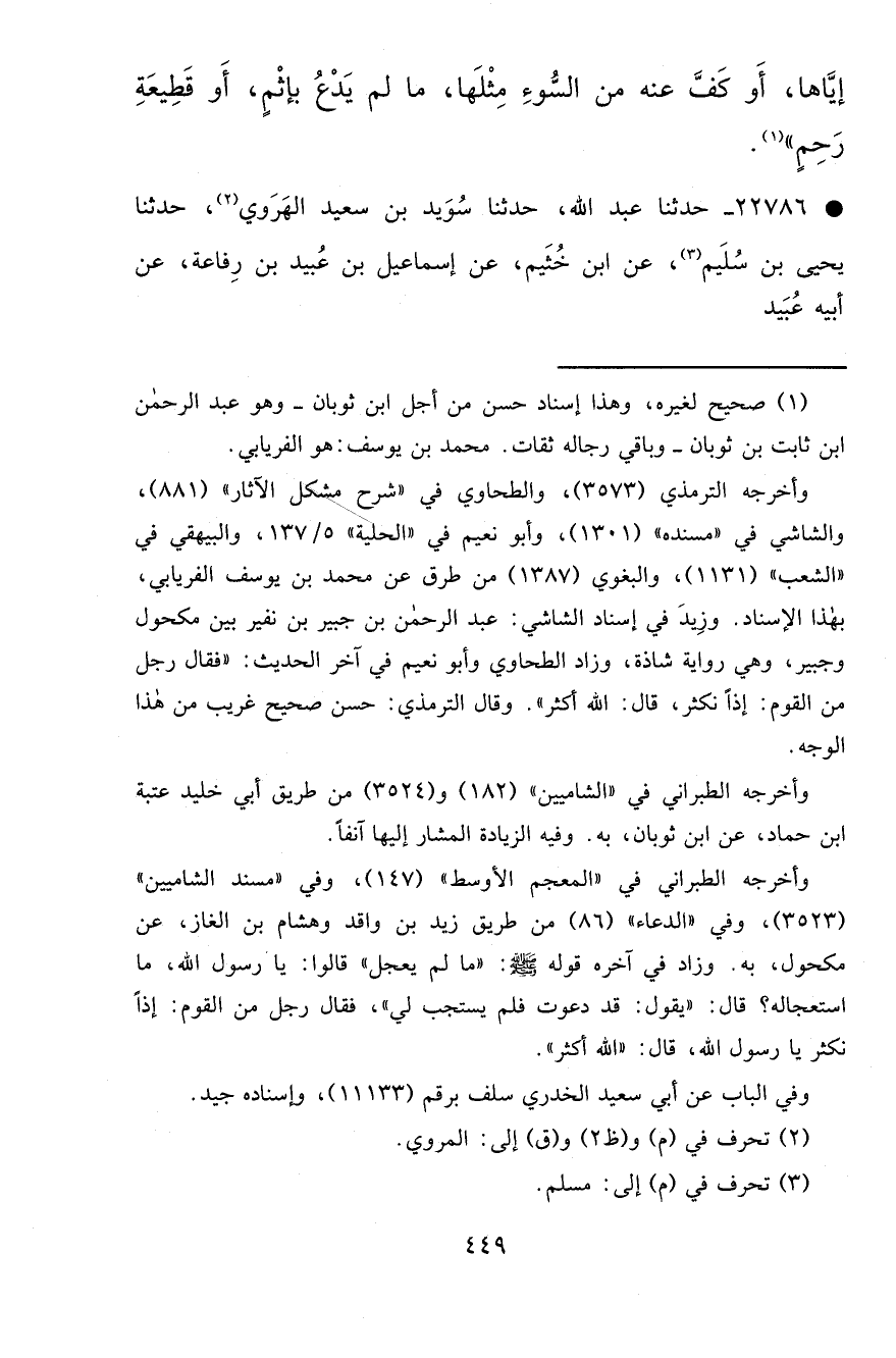 وأخرجه الطبراني في "المعجم الأوسط" (١٤٧) ، وفي "مسند الشاميين" (٣٥٢٣) ، وفي "الدعاء" (٨٦) من طريق زيد بن واقد وهشام بن الغاز، عن مكحول، به. وزاد في آخره قوله صَلَّى اللهُ عَلَيْهِ وَسَلَّمَ: "ما لم يعجل" قالوا: يا رسول الله، ما استعجاله؟ قال: "يقول: قد دعوت فلم يستجب لي"، فقال رجل من القوم: إذاً نكثر يا رسول الله، قال: "الله أكثر".