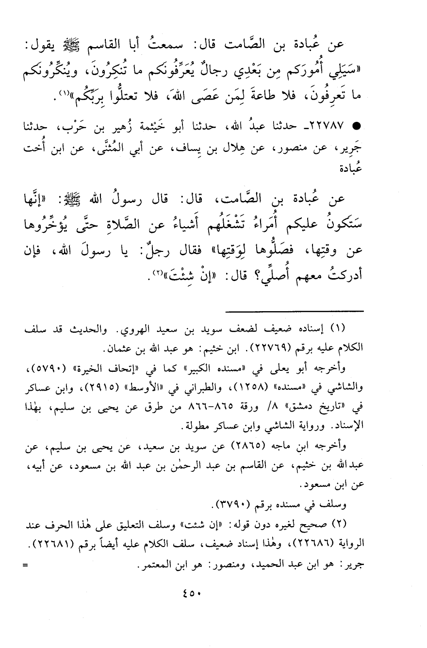 • ٢٢٧٨٧ - حَدَّثَنَا عَبْدُ اللهِ، حَدَّثَنَا أَبُو خَيْثَمَةَ زُهَيْرُ بْنُ حَرْبٍ، حَدَّثَنَا جَرِيرٌ، عَنْ مَنْصُورٍ، عَنْ هِلَالِ بْنِ يَسَافٍ، عَنْ أَبِي الْمُثَنَّى، عَنِ ابْنِ أُخْتِ عُبَادَةَ، عَنْ عُبَادَةَ بْنِ الصَّامِتِ قَالَ: قَالَ رَسُولُ اللهِ صَلَّى اللهُ عَلَيْهِ وَسَلَّمَ: " إِنَّهَا سَتَكُونُ عَلَيْكُمْ أُمَرَاءُ تَشْغَلُهُمْ أَشْيَاءُ عَنِ الصَّلَاةِ حَتَّى يُؤَخِّرُوهَا عَنْ وَقْتِهَا فَصَلُّوهَا لِوَقْتِهَا ". فَقَالَ رَجُلٌ: يَا رَسُولَ اللهِ، فَإِنْ أَدْرَكْتُ مَعَهُمْ أُصَلِّي؟ قَالَ: " إِنْ شِئْتَ " (٢)