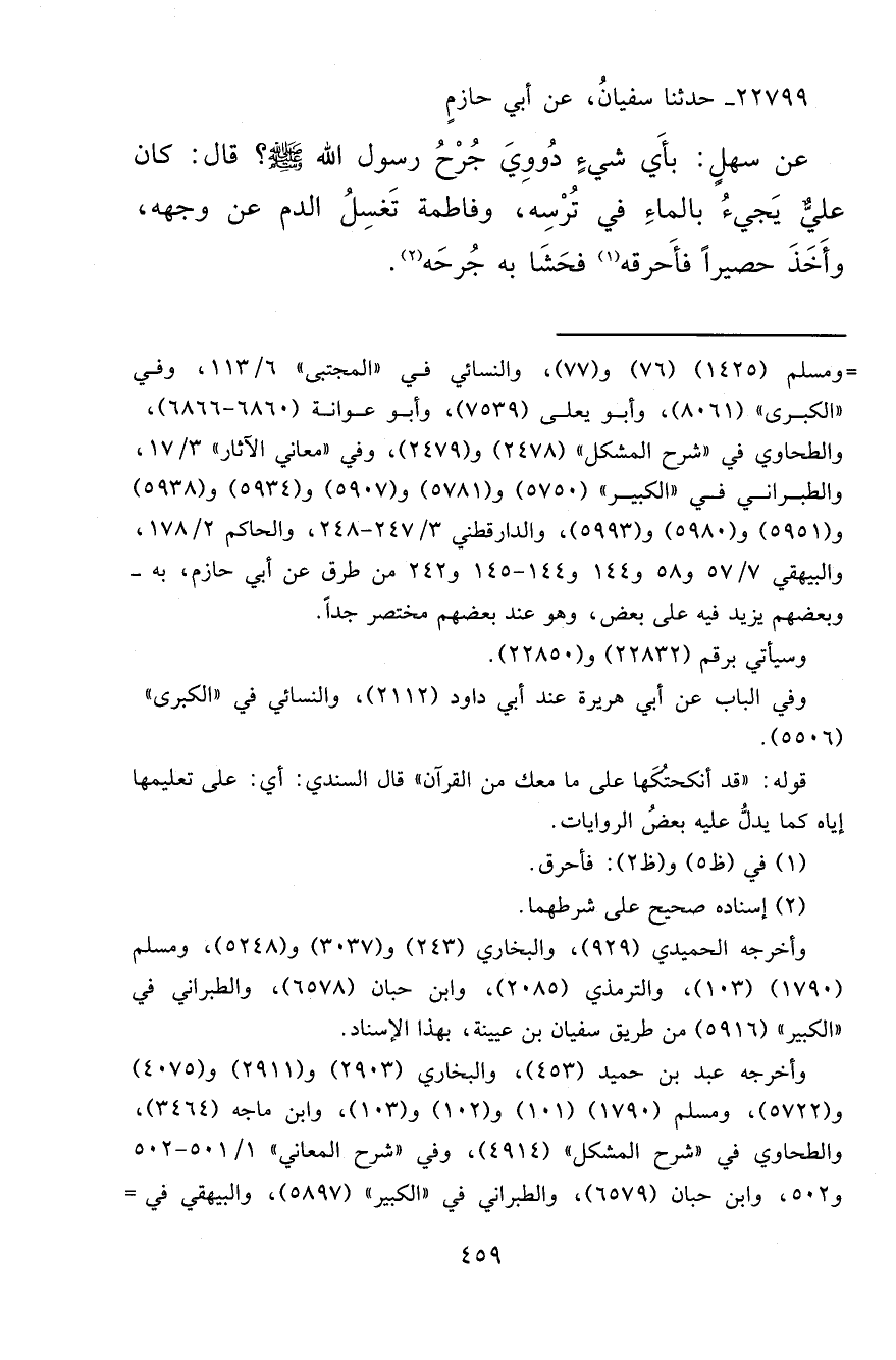٢٢٧٩٩ - حَدَّثَنَا سُفْيَانُ، عَنْ أَبِي حَازِمٍ، عَنْ سَهْلٍ، " بِأَيِّ شَيْءٍ دُووِيَ جُرْحُ رَسُولِ اللهِ صَلَّى اللهُ عَلَيْهِ وَسَلَّمَ؟ قَالَ: كَانَ عَلِيٌّ يَجِيءُ بِالْمَاءِ فِي تُرْسِهِ، وَفَاطِمَةُ تَغْسِلُ الدَّمَ عَنْ وَجْهِهِ، وَأَخَذَ حَصِيرًا فَأَحْرَقَهُ (١) ، فَحَشَا بِهِ جُرْحَهُ " (٢)