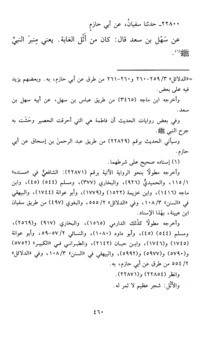 ٢٢٨٠٠ - حَدَّثَنَا سُفْيَانُ، عَنْ أَبِي حَازِمٍ، عَنْ سَهْلِ بْنِ سَعْدٍ قَالَ: " كَانَ مِنْ أَثْلِ الْغَابَةِ " يَعْنِي: مِنْبَرَ النَّبِيِّ صَلَّى اللهُ عَلَيْهِ وَسَلَّمَ (١)