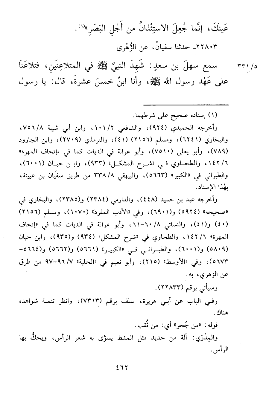٢٢٨٠٣ - حَدَّثَنَا سُفْيَانُ، عَنِ الزُّهْرِيِّ، سَمِعَ سَهْلَ بْنَ سَعْدٍ شَهِدَ النَّبِيَّ صَلَّى اللهُ عَلَيْهِ وَسَلَّمَ: فِي الْمُتَلَاعِنَيْنِ فَتَلَاعَنَا عَلَى عَهْدِ رَسُولِ اللهِ صَلَّى اللهُ عَلَيْهِ وَسَلَّمَ. وَأَنَا ابْنُ خَمْسَ عَشْرَةَ قَالَ يَا رَسُولَ