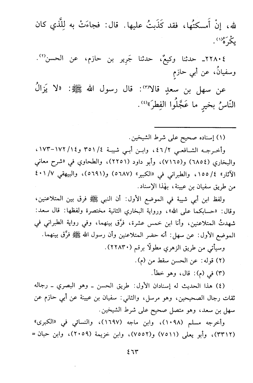 ٢٢٨٠٤ - حَدَّثَنَا وَكِيعٌ، حَدَّثَنَا جَرِيرُ بْنُ حَازِمٍ، عَنِ الْحَسَنِ (٢) وَسُفْيَانُ، عَنْ أَبِي حَازِمٍ، عَنْ سَهْلِ بْنِ سَعْدٍ قَالَا (٣) : قَالَ رَسُولُ اللهِ صَلَّى اللهُ عَلَيْهِ وَسَلَّمَ: " لَا يَزَالُ النَّاسُ بِخَيْرٍ مَا عَجَّلُوا الْفِطْرَ " (٤)