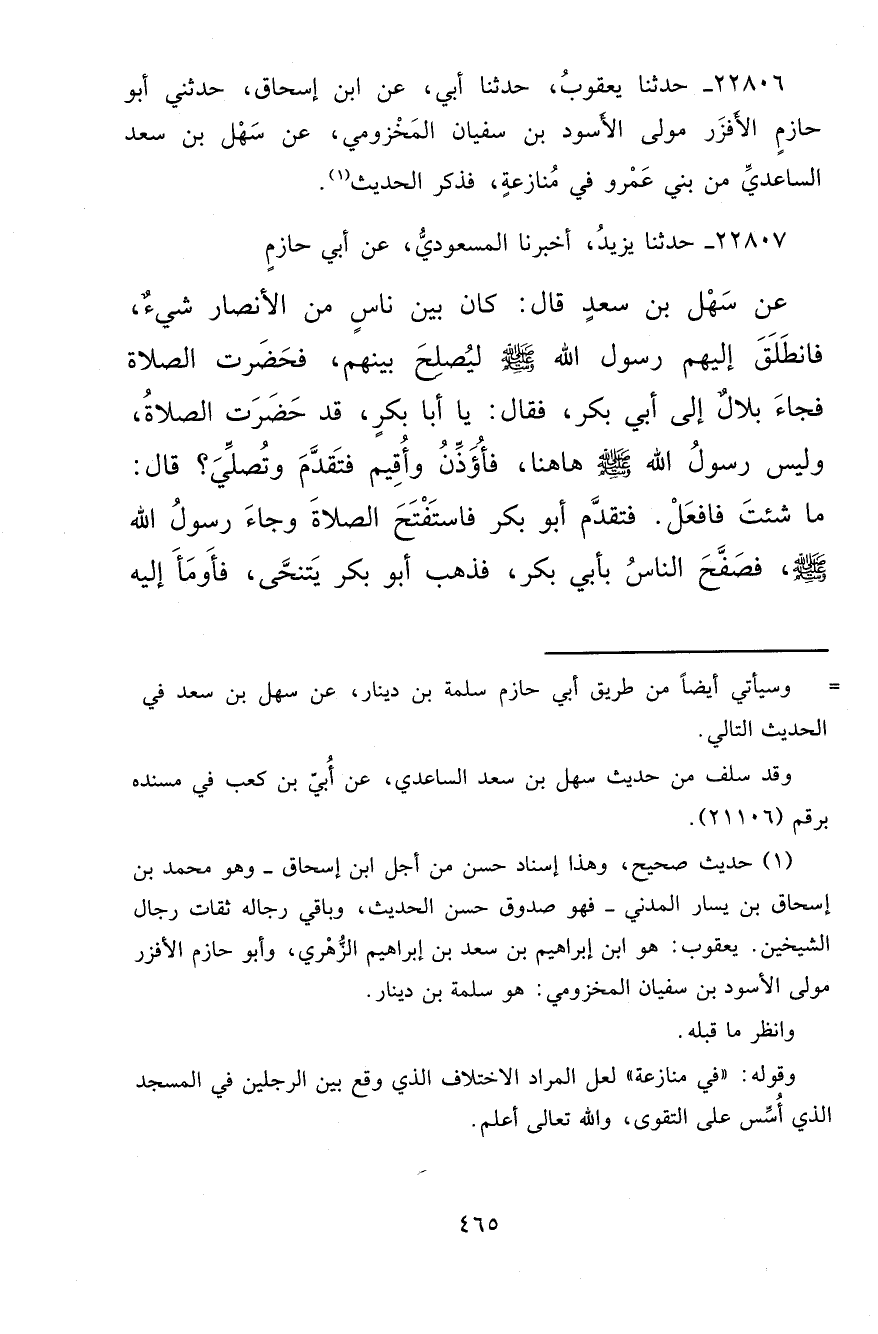 ٢٢٨٠٦ - حَدَّثَنَا يَعْقُوبُ، حَدَّثَنَا أَبِي، عَنِ ابْنِ إِسْحَاقَ حَدَّثَنِي أَبُو حَازِمٍ الْأَفْزَرُ مَوْلَى الْأَسْوَدِ بْنِ سُفْيَانَ الْمَخْزُومِيِّ، عَنْ سَهْلِ بْنِ سَعْدٍ السَّاعِدِيِّ مِنْ بَنِي عَمْرٍو فِي مُنَازَعَةٍ فَذَكَرَ الْحَدِيثَ (١)
