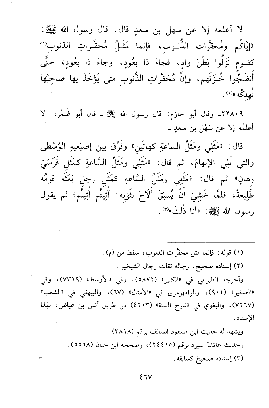لَا أَعْلَمُهُ إِلَّا عَنْ سَهْلِ بْنِ سَعْدٍ قَالَ: قَالَ رَسُولُ اللهِ صَلَّى اللهُ عَلَيْهِ وَسَلَّمَ: " إِيَّاكُمْ وَمُحَقَّرَاتِ الذُّنُوبِ فَإِنَّمَا مَثَلُ مُحَقَّرَاتِ الذُّنُوبِ (١) كَقَوْمٍ نَزَلُوا فِي بَطْنِ وَادٍ، فَجَاءَ ذَا بِعُودٍ، وَجَاءَ ذَا بِعُودٍ حَتَّى أَنْضَجُوا خُبْزَتَهُمْ، وَإِنَّ مُحَقَّرَاتِ الذُّنُوبِ مَتَى يُؤْخَذْ بِهَا صَاحِبُهَا تُهْلِكْهُ " (٢)