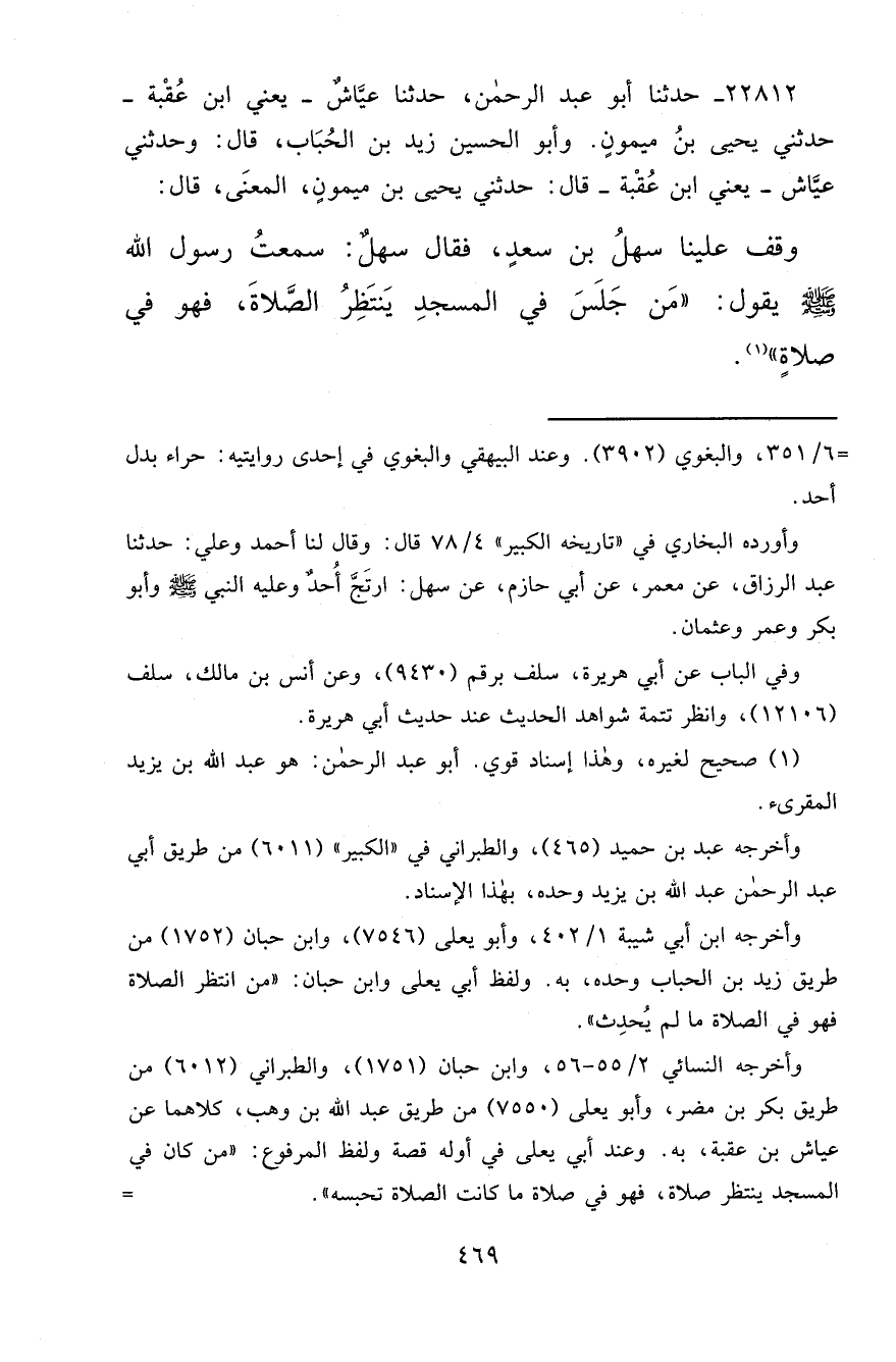 ٢٢٨١٢ - حَدَّثَنَا أَبُو عَبْدِ الرَّحْمَنِ، حَدَّثَنَا عَيَّاشٌ يَعْنِي ابْنَ عُقْبَةَ، حَدَّثَنِي يَحْيَى بْنُ مَيْمُونٍ، وَأَبُو الْحُسَيْنِ زَيْدُ بْنُ الْحُبَابِ قَالَ: وَحَدَّثَنِي عَيَّاشٌ يَعْنِي ابْنَ عُقْبَةَ قَالَ: حَدَّثَنِي يَحْيَى بْنُ مَيْمُونٍ الْمَعْنَى، وَقَفَ عَلَيْنَا سَهْلُ بْنُ سَعْدٍ فَقَالَ: سَهْلٌ سَمِعْتُ رَسُولَ اللهِ صَلَّى اللهُ عَلَيْهِ وَسَلَّمَ يَقُولُ: " مَنْ جَلَسَ فِي الْمَسْجِدِ يَنْتَظِرُ الصَّلَاةَ فَهُوَ فِي صَلَاةٍ " (١)