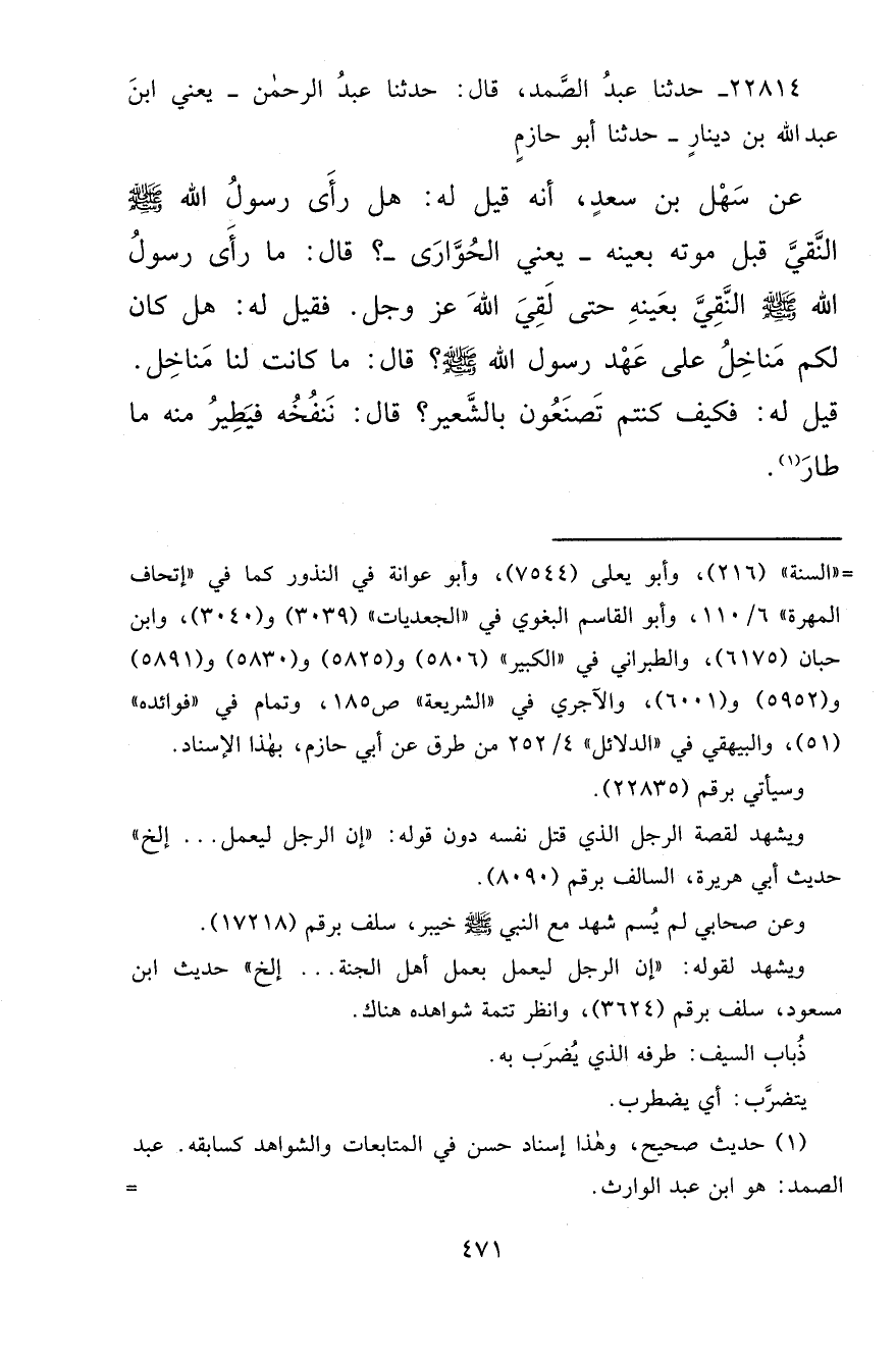 ٢٢٨١٤ - حَدَّثَنَا عَبْدُ الصَّمَدِ قَالَ: حَدَّثَنَا عَبْدُ الرَّحْمَنِ يَعْنِي ابْنَ عَبْدِ اللهِ بْنِ دِينَارٍ، حَدَّثَنَا أَبُو حَازِمٍ، عَنْ سَهْلِ بْنِ سَعْدٍ أَنَّهُ قِيلَ لَهُ هَلْ رَأَى رَسُولُ اللهِ صَلَّى اللهُ عَلَيْهِ وَسَلَّمَ النَّقِيَّ قَبْلَ مَوْتِهِ بِعَيْنِهِ، يَعْنِي الْحُوَّارَى،؟ قَالَ: " مَا رَأَى رَسُولُ اللهِ صَلَّى اللهُ عَلَيْهِ وَسَلَّمَ النَّقِيَّ بِعَيْنِهِ حَتَّى لَقِيَ اللهَ عَزَّ وَجَلَّ "