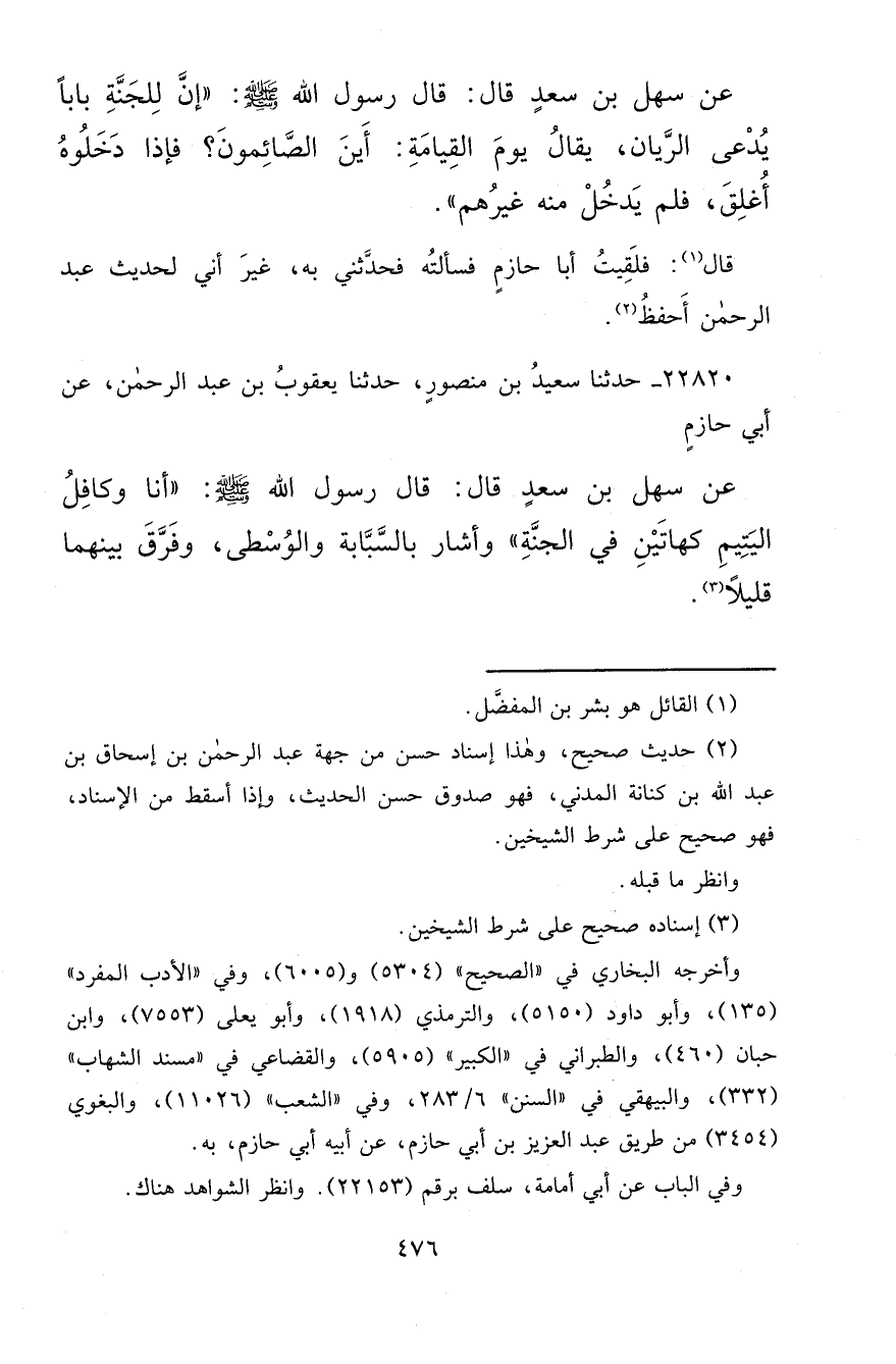 ٢٢٨٢٠ - حَدَّثَنَا سَعِيدُ بْنُ مَنْصُورٍ، حَدَّثَنَا يَعْقُوبُ بْنُ عَبْدِ الرَّحْمَنِ، عَنْ أَبِي حَازِمٍ، عَنْ سَهْلِ بْنِ سَعْدٍ قَالَ: قَالَ رَسُولُ اللهِ صَلَّى اللهُ عَلَيْهِ وَسَلَّمَ: " أَنَا وَكَافِلُ الْيَتِيمِ كَهَاتَيْنِ فِي الْجَنَّةِ، وَأَشَارَ بِالسَّبَّابَةِ وَالْوُسْطَى " وَفَرَّقَ بَيْنَهُمَا قَلِيلًا (٣)