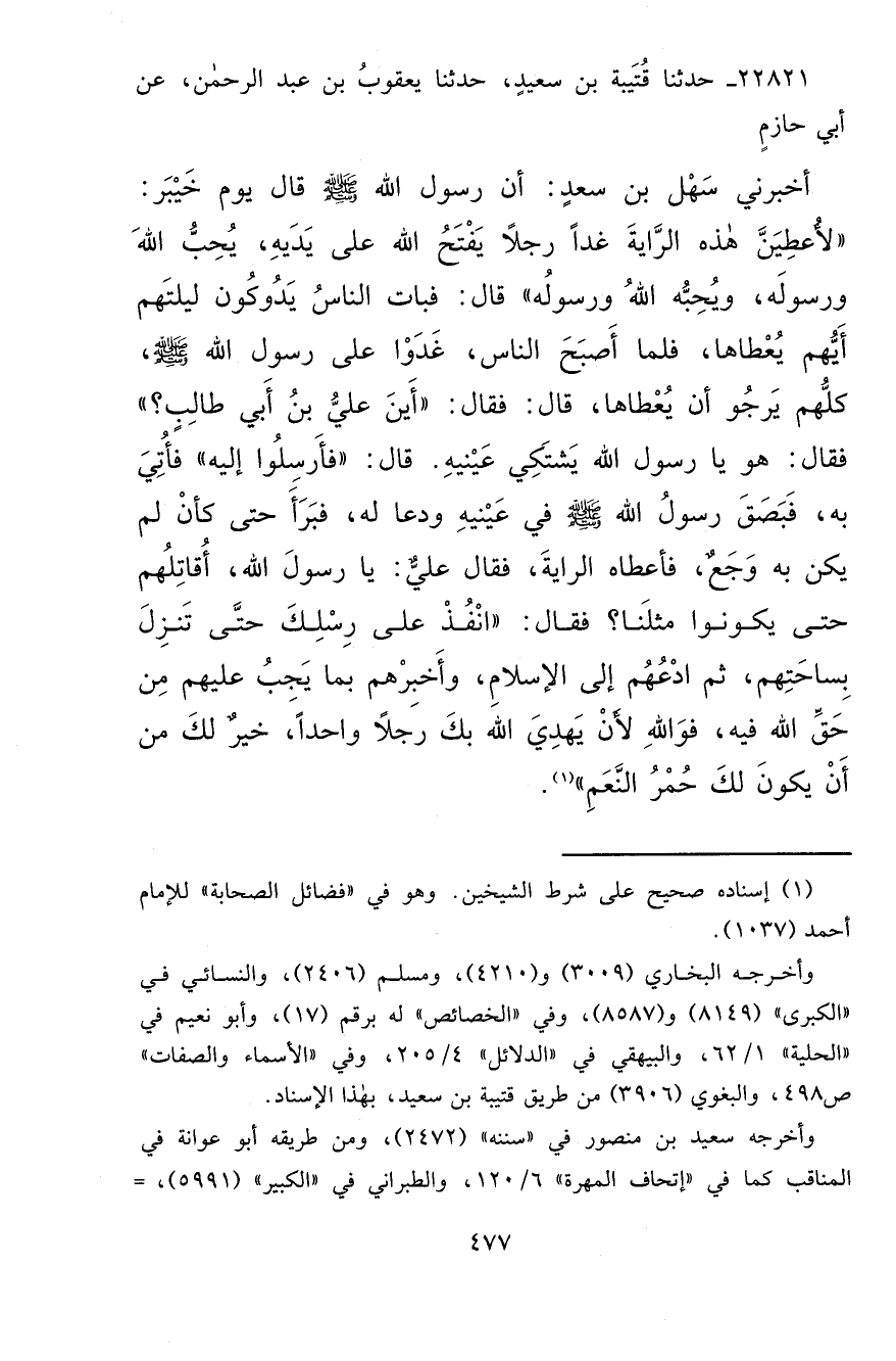 ٢٢٨٢١ - حَدَّثَنَا قُتَيْبَةُ بْنُ سَعِيدٍ، حَدَّثَنَا يَعْقُوبُ بْنُ عَبْدِ الرَّحْمَنِ، عَنْ أَبِي حَازِمٍ، أَخْبَرَنِي سَهْلُ بْنُ سَعْدٍ، أَنَّ رَسُولَ اللهِ صَلَّى اللهُ عَلَيْهِ وَسَلَّمَ قَالَ يَوْمَ خَيْبَرَ: " لَأُعْطِيَنَّ هَذِهِ الرَّايَةَ غَدًا رَجُلًا يَفْتَحُ اللهُ عَلَى يَدَيْهِ يُحِبُّ اللهَ وَرَسُولَهُ، وَيُحِبُّهُ اللهُ وَرَسُولُهُ ". قَالَ: فَبَاتَ النَّاسُ يَدُوكُونَ لَيْلَتَهُمْ أَيُّهُمْ يُعْطَاهَا؟ فَلَمَّا أَصْبَحَ النَّاسُ غَدَوْا عَلَى رَسُولِ اللهِ صَلَّى اللهُ عَلَيْهِ وَسَلَّمَ كُلُّهُمْ يَرْجُو أَنْ يُعْطَاهَا فَقَالَ: " أَيْنَ عَلِيُّ بْنُ أَبِي طَالِبٍ؟ " فَقَالَ: هُوَ يَا رَسُولَ اللهِ، يَشْتَكِي عَيْنَيْهِ. قَالَ: " فَأَرْسِلُوا إِلَيْهِ ". فَأُتِيَ بِهِ فَبَصَقَ رَسُولُ اللهِ صَلَّى اللهُ عَلَيْهِ وَسَلَّمَ فِي عَيْنَيْهِ، وَدَعَا لَهُ فَبَرَأَ حَتَّى كَأَنْ لَمْ يَكُنْ بِهِ وَجَعٌ، فَأَعْطَاهُ الرَّايَةَ. فَقَالَ عَلِيٌّ: يَا رَسُولَ اللهِ، أُقَاتِلُهُمْ حَتَّى يَكُونُوا مِثْلَنَا. فَقَالَ: " انْفُذْ عَلَى رِسْلِكَ حَتَّى تَنْزِلَ بِسَاحَتِهِمْ، ثُمَّ ادْعُهُمْ إِلَى الْإِسْلَامِ، وَأَخْبِرْهُمْ بِمَا يَجِبُ عَلَيْهِمْ مِنْ حَقِّ اللهِ فِيهِ، فَوَاللهِ لَأَنْ يَهْدِيَ اللهُ بِكَ رَجُلًا وَاحِدًا خَيْرٌ لَكَ مِنْ أَنْ يَكُونَ لَكَ حُمْرُ النَّعَمِ " (١)