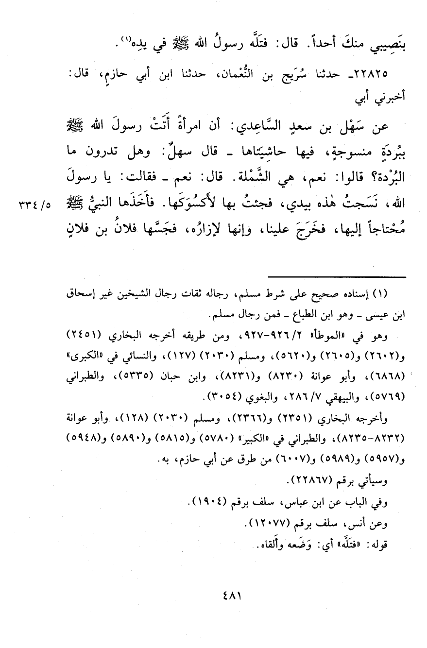 ٢٢٨٢٥ - حَدَّثَنَا سُرَيْجُ بْنُ النُّعْمَانِ، حَدَّثَنَا ابْنُ أَبِي حَازِمٍ قَالَ: أَخْبَرَنِي أَبِي، عَنْ سَهْلِ بْنِ سَعْدٍ السَّاعِدِيِّ، أَنَّ امْرَأَةً أَتَتْ رَسُولَ اللهِ صَلَّى اللهُ عَلَيْهِ وَسَلَّمَ بِبُرْدَةٍ مَنْسُوجَةٍ فِيهَا حَاشِيَتَاهَا، قَالَ سَهْلٌ: وَهَلْ تَدْرُونَ مَا الْبُرْدَةُ؟ قَالُوا: نَعَمْ. هِيَ الشَّمْلَةُ. قَالَ: نَعَمْ. فَقَالَتْ: يَا رَسُولَ اللهِ، نَسَجْتُ هَذِهِ بِيَدِي فَجِئْتُ بِهَا لِأَكْسُوَكَهَا، فَأَخَذَهَا النَّبِيُّ صَلَّى اللهُ عَلَيْهِ وَسَلَّمَ مُحْتَاجًا إِلَيْهَا، فَخَرَجَ عَلَيْنَا، وَإِنَّهَا لَإِزَارُهُ فَجَسَّهَا فُلَانُ بْنُ فُلَانٍ،