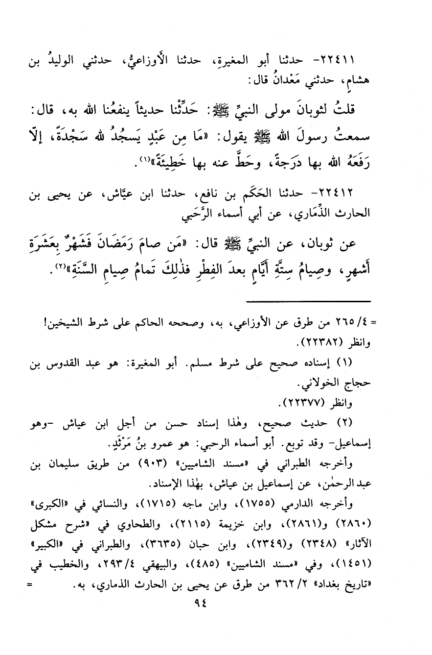٢٢٤١٢ - حَدَّثَنَا الْحَكَمُ بْنُ نَافِعٍ، حَدَّثَنَا ابْنُ عَيَّاشٍ، عَنْ يَحْيَى بْنِ الْحَارِثِ الذِّمَارِيِّ، عَنْ أَبِي أَسْمَاءَ الرَّحَبِيِّ، عَنْ ثَوْبَانَ، عَنِ النَّبِيِّ صَلَّى اللهُ عَلَيْهِ وَسَلَّمَ قَالَ: " مَنْ صَامَ رَمَضَانَ فَشَهْرٌ بِعَشَرَةِ أَشْهُرٍ، وَصِيَامُ سِتَّةِ أَيَّامٍ بَعْدَ الْفِطْرِ فَذَلِكَ تَمَامُ صِيَامِ السَّنَةِ " (٢)
