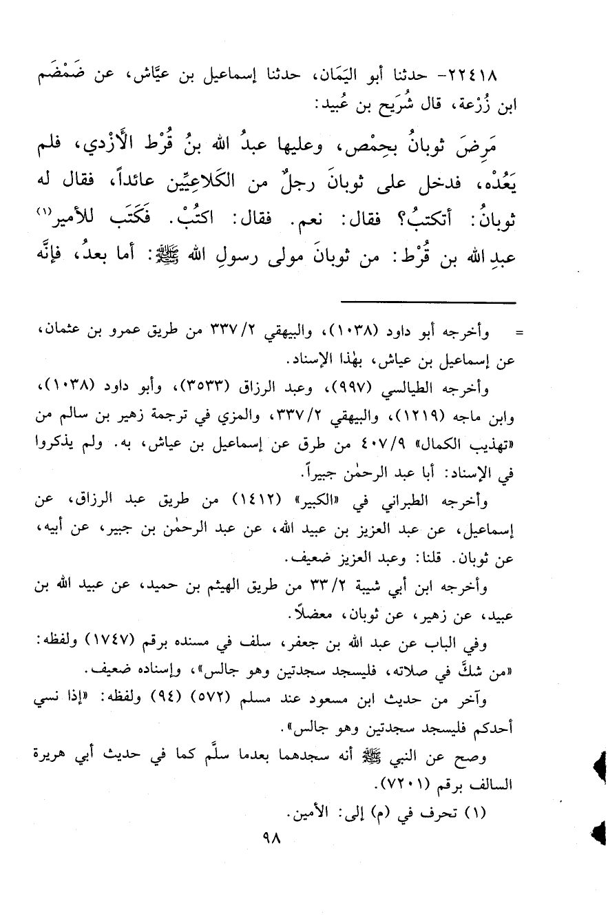 ٢٢٤١٨ - حَدَّثَنَا أَبُو الْيَمَانِ، حَدَّثَنَا إِسْمَاعِيلُ بْنُ عَيَّاشٍ، عَنْ ضَمْضَمِ بْنِ زُرْعَةَ قَالَ: شُرَيْحُ بْنُ عُبَيْدٍ: مَرِضَ ثَوْبَانُ بِحِمْصَ وَعَلَيْهَا عَبْدُ اللهِ بْنُ قُرْطٍ الْأَزْدِيُّ، فَلَمْ يَعُدْهُ فَدَخَلَ عَلَى ثَوْبَانَ رَجُلٌ مِنَ الْكَلَاعِيِّينَ عَائِدًا. فَقَالَ لَهُ ثَوْبَانُ: أَتَكْتُبُ؟ فَقَالَ: نَعَمْ. فَقَالَ: اكْتُبْ. فَكَتَبَ لِلْأَمِيرِ (١) عَبْدِ اللهِ بْنِ قُرْطٍ مِنْ ثَوْبَانَ مَوْلَى رَسُولِ اللهِ صَلَّى اللهُ عَلَيْهِ وَسَلَّمَ أَمَّا بَعْدُ، فَإِنَّهُ