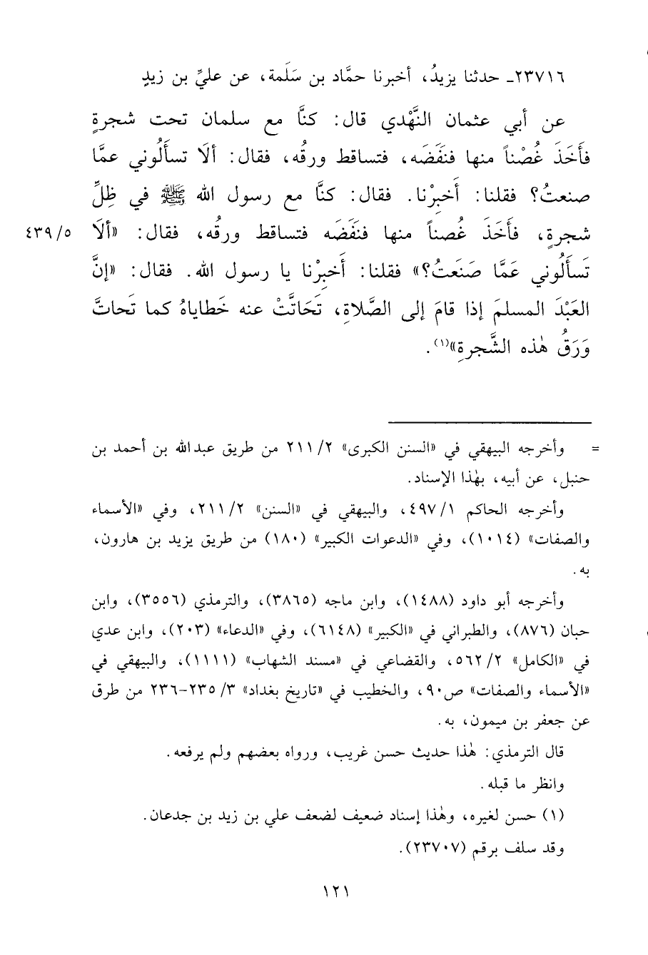 ٢٣٧١٦ - حَدَّثَنَا يَزِيدُ، أَخْبَرَنَا حَمَّادُ بْنُ سَلَمَةَ، عَنْ عَلِيِّ بْنِ زَيْدٍ، عَنْ أَبِي عُثْمَانَ النَّهْدِيِّ، قَالَ: كُنَّا مَعَ سَلْمَانَ تَحْتَ شَجَرَةٍ فَأَخَذَ غُصْنًا مِنْهَا فَنَفَضَهُ فَتَسَاقَطَ وَرَقُهُ فَقَالَ: أَلَا تَسْأَلُونِي عَمَّا صَنَعْتُ؟ فَقُلْنَا: أَخْبِرْنَا فَقَالَ: كُنَّا مَعَ رَسُولِ اللهِ صَلَّى اللهُ عَلَيْهِ وَسَلَّمَ فِي ظِلِّ شَجَرَةٍ فَأَخَذَ غُصْنًا مِنْهَا فَنَفَضَهُ فَتَسَاقَطَ وَرَقُهُ، فَقَالَ: " أَلَا تَسْأَلُونِي عَمَّا صَنَعْتُ؟ " فَقُلْنَا: أَخْبِرْنَا يَا رَسُولَ اللهِ، فَقَالَ: " إِنَّ الْعَبْدَ الْمُسْلِمَ إِذَا قَامَ إِلَى الصَّلَاةِ، تَحَاتَّتْ عَنْهُ خَطَايَاهُ كَمَا تَحَاتَّ وَرَقُ هَذِهِ الشَّجَرَةِ " (١)