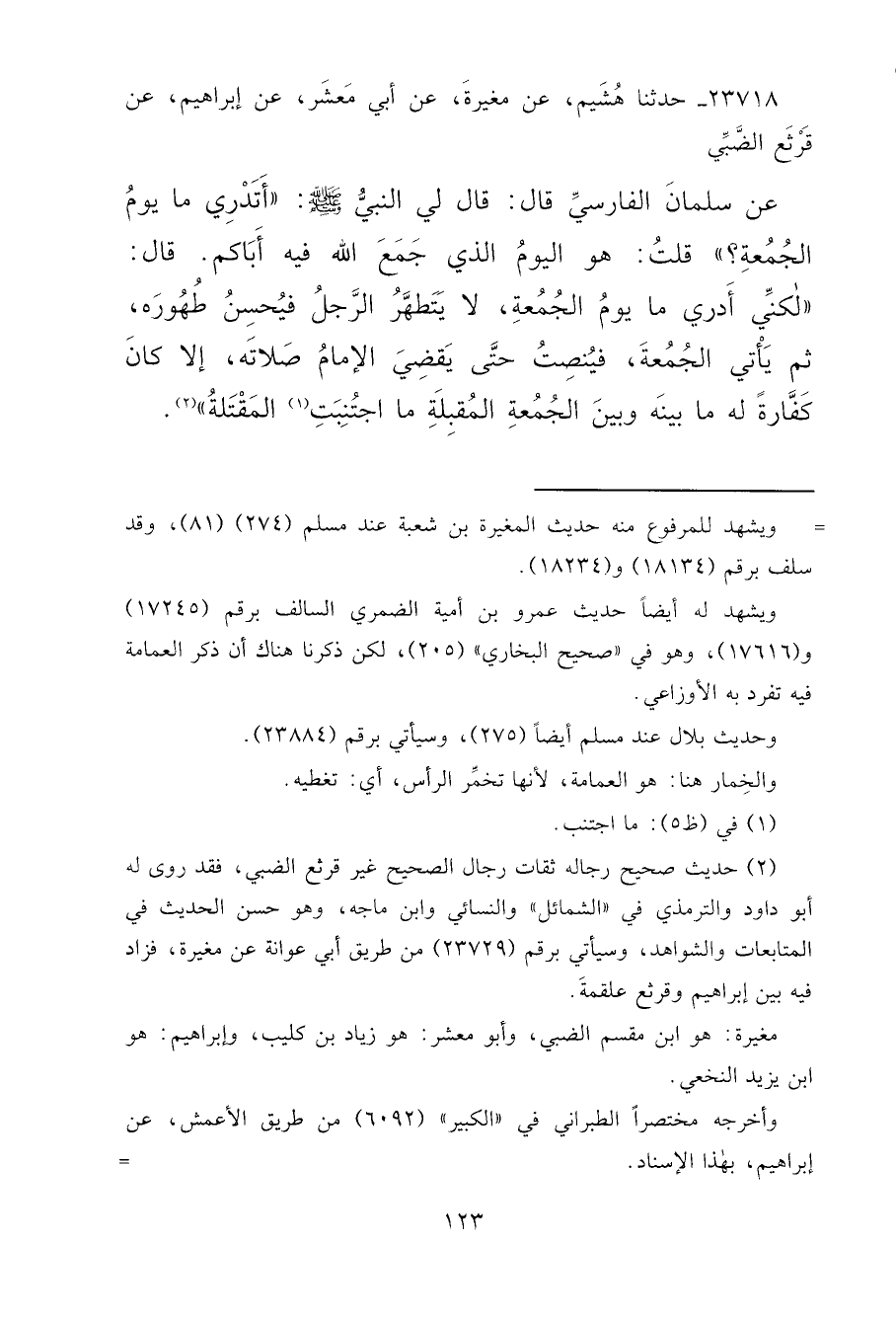 ٢٣٧١٨ - حَدَّثَنَا هُشَيْمٌ، عَنْ مُغِيرَةَ، عَنْ أَبِي مَعْشَرٍ، عَنْ إِبْرَاهِيمَ، عَنْ قَرْثَعٍ الضَّبِّيِّ، عَنْ سَلْمَانَ الْفَارِسِيِّ، قَالَ: قَالَ لِي النَّبِيُّ صَلَّى اللهُ عَلَيْهِ وَسَلَّمَ: " أَتَدْرِي مَا يَوْمُ الْجُمُعَةِ؟ " قُلْتُ: هُوَ الْيَوْمُ الَّذِي جَمَعَ اللهُ فِيهِ أَبَاكُمْ، قَالَ: " لَكِنِّي أَدْرِي مَا يَوْمُ الْجُمُعَةِ، لَا يَتَطَهَّرُ الرَّجُلُ فَيُحْسِنُ طُهُورَهُ، ثُمَّ يَأْتِي الْجُمُعَةَ، فَيُنْصِتُ حَتَّى يَقْضِيَ الْإِمَامُ صَلَاتَهُ، إِلَّا كَانَ كَفَّارَةً لَهُ مَا بَيْنَهُ وَبَيْنَ الْجُمُعَةِ الْمُقْبِلَةِ مَا اجْتُنِبَتِ (١) الْمَقْتَلَةُ " (٢)