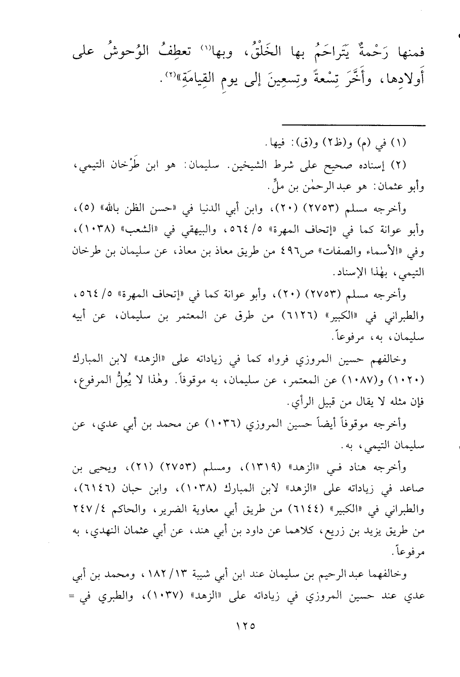 وخالفهما عبد الرحيم بن سليمان عند ابن أبي شيبة ١٣/١٨٢، ومحمد بن أبي عدي عند حسين المروزي في زياداته على "الزهد" (١٠٣٧) ، والطبري في=