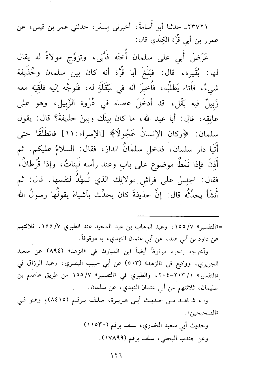 ٢٣٧٢١ - حَدَّثَنَا أَبُو أُسَامَةَ، أَخْبَرَنِي مِسْعَرٌ، حَدَّثَنِي عُمَرُ بْنُ قَيْسٍ، عَنْ عَمْرِو بْنِ أَبِي قُرَّةَ الْكِنْدِيِّ، قَالَ: عَرَضَ أَبِي عَلَى سَلْمَانَ أُخْتَهُ فَأَبَى، وَتَزَوَّجَ مَوْلَاةً لَهُ يُقَالُ لَهَا: بُقَيْرَةُ، قَالَ: فَبَلَغَ أَبَا قُرَّةَ أَنَّهُ كَانَ بَيْنَ سَلْمَانَ، وَحُذَيْفَةَ شَيْءٌ، فَأَتَاهُ يَطْلُبُهُ، فَأُخْبِرَ أَنَّهُ فِي مَبْقَلَةٍ لَهُ، فَتَوَجَّهَ إِلَيْهِ فَلَقِيَهُ مَعَهُ زَبِيلٌ فِيهِ بَقْلٌ، قَدْ أَدْخَلَ عَصَاهُ فِي عُرْوَةِ الزَّبِيلِ، وَهُوَ عَلَى عَاتِقِهِ، قَالَ: أَبَا عَبْدِ اللهِ: مَا كَانَ بَيْنَكَ وَبَيْنَ حُذَيْفَةَ؟ قَالَ: يَقُولُ سَلْمَانُ: {وَكَانَ الْإِنْسَانُ عَجُولًا} [الإسراء: ١١] فَانْطَلَقَا حَتَّى أَتَيَا دَارَ سَلْمَانَ فَدَخَلَ سَلْمَانُ الدَّارَ، فَقَالَ: السَّلَامُ عَلَيْكُمْ، ثُمَّ أَذِنَ فَإِذَا نَمَطٌ مَوْضُوعٌ عَلَى بَابٍ، وَعِنْدَ رَأْسِهِ لَبِنَاتٌ، وَإِذَا قُرْطَانِ، فَقَالَ: اجْلِسْ عَلَى فِرَاشِ مَوْلَاتِكَ الَّذِي تُمَهِّدُ لِنَفْسِهَا قَالَ: ثُمَّ أَنْشَأَ يُحَدِّثُهُ قَالَ: إِنَّ حُذَيْفَةَ كَانَ يُحَدِّثُ بِأَشْيَاءَ يَقُولُهَا رَسُولُ اللهِ صَلَّى اللهُ عَلَيْهِ وَسَلَّمَ