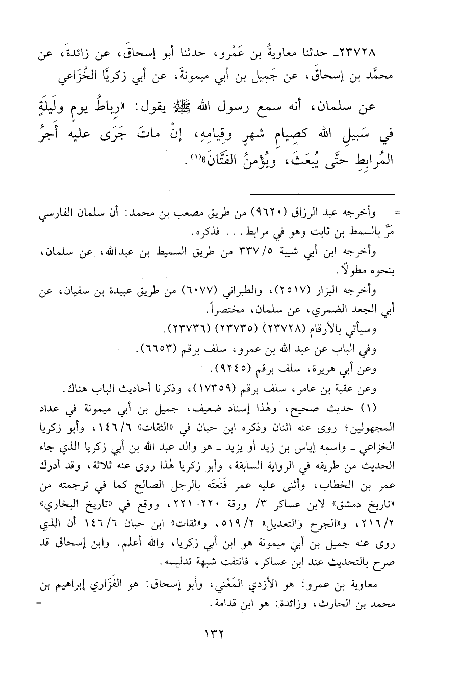 ٢٣٧٢٨ - حَدَّثَنَا مُعَاوِيَةُ بْنُ عَمْرٍو، حَدَّثَنَا أَبُو إِسْحَاقَ، عَنْ زَائِدَةَ، عَنْ مُحَمَّدِ بْنِ إِسْحَاقَ، عَنْ جَمِيلِ بْنِ أَبِي مَيْمُونَةَ، عَنْ ابْنِ أَبِي زَكَرِيَّا الْخُزَاعِيِّ، عَنْ سَلْمَانَ، أَنَّهُ سَمِعَ رَسُولَ اللهِ صَلَّى اللهُ عَلَيْهِ وَسَلَّمَ يَقُولُ: " رِبَاطُ يَوْمٍ وَلَيْلَةٍ فِي سَبِيلِ اللهِ كَصِيَامِ شَهْرٍ وَقِيَامِهِ، إِنْ مَاتَ جَرَى عَلَيْهِ أَجْرُ الْمُرَابِطِ حَتَّى يُبْعَثَ، وَيُؤْمَنَ الْفَتَّانَ " (١)