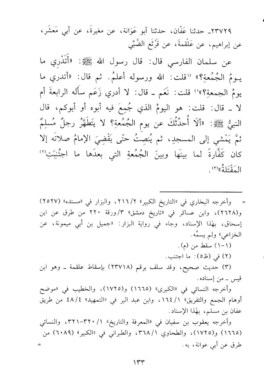 ٢٣٧٢٩ - حَدَّثَنَا عَفَّانُ، حَدَّثَنَا أَبُو عَوَانَةَ، عَنْ مُغِيرَةَ، عَنْ أَبِي مَعْشَرٍ، عَنْ إِبْرَاهِيمَ، عَنْ عَلْقَمَةَ، عَنْ قَرْثَعٍ الضَّبِّيِّ، عَنْ سَلْمَانَ الْفَارِسِيِّ قَالَ: قَالَ رَسُولُ اللهِ صَلَّى اللهُ عَلَيْهِ وَسَلَّمَ: " أَتَدْرِي مَا يَوْمُ الْجُمُعَةِ؟ " (١ قُلْتُ: اللهُ وَرَسُولُهُ أَعْلَمُ. ثُمَّ قَالَ: " أَتَدْرِي مَا يَوْمُ الْجُمُعَةِ؟ "١) قُلْتُ نَعَمْ، قَالَ: لَا أَدْرِي زَعَمَ سَأَلَهُ الرَّابِعَةَ أَمْ لَا، قَالَ: قُلْتُ: هُوَ الْيَوْمُ الَّذِي جُمِعَ فِيهِ أَبُوهُ أَوْ أَبُوكُمْ، قَالَ النَّبِيُّ صَلَّى اللهُ عَلَيْهِ وَسَلَّمَ: " أَلَا أُحَدِّثُكَ عَنْ يَوْمِ الْجُمُعَةِ؟ لَا يَتَطَهَّرُ رَجُلٌ مُسْلِمٌ، ثُمَّ يَمْشِي إِلَى الْمَسْجِدِ، ثُمَّ يُنْصِتُ حَتَّى يَقْضِيَ الْإِمَامُ صَلَاتَهُ إِلَّا كَانَ كَفَّارَةً لِمَا بَيْنَهَا وَبَيْنَ الْجُمُعَةِ الَّتِي بَعْدَهَا مَا اجْتُنِبَتِ (٢) الْمَقْتَلَةُ " (٣)