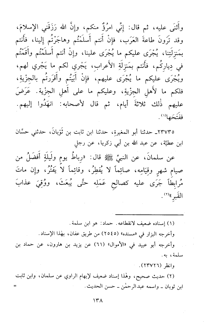 ٢٣٧٣٥ - حَدَّثَنَا أَبُو الْمُغِيرَةِ، حَدَّثَنَا ابْنُ ثَابِتِ بْنِ ثَوْبَانَ، حَدَّثَنِي حَسَّانُ بْنُ عَطِيَّةَ، عَنْ عَبْدِ اللهِ بْنِ أَبِي زَكَرِيَّا، عَنْ رَجُلٍ، عَنْ سَلْمَانَ، عَنِ النَّبِيِّ صَلَّى اللهُ عَلَيْهِ وَسَلَّمَ قَالَ: " رِبَاطُ يَوْمٍ وَلَيْلَةٍ أَفْضَلُ مِنْ صِيَامِ شَهْرٍ وَقِيَامِهِ، صَائِمًا لَا يُفْطِرُ، وَقَائِمًا لَا يَفْتُرُ، وَإِنْ مَاتَ مُرَابِطًا جَرَى عَلَيْهِ كَصَالِحِ عَمَلِهِ حَتَّى يُبْعَثَ، وَوُقِيَ عَذَابَ الْقَبْرِ " (٢)