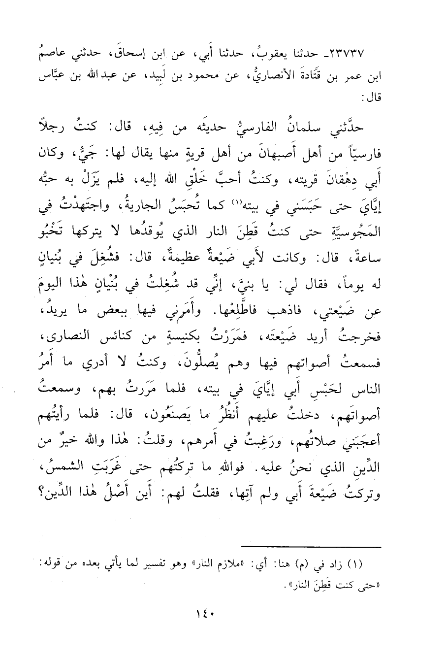 ٢٣٧٣٧ - حَدَّثَنَا يَعْقُوبُ، حَدَّثَنَا أَبِي، عَنِ ابْنِ إِسْحَاقَ، حَدَّثَنِي عَاصِمُ بْنُ عُمَرَ بْنِ قَتَادَةَ الْأَنْصَارِيُّ، عَنْ مَحْمُودِ بْنِ لَبِيدٍ، عَنْ عَبْدِ اللهِ بْنِ عَبَّاسٍ، قَالَ: حَدَّثَنِي سَلْمَانُ الْفَارِسِيُّ حَدِيثَهُ مِنْ فِيهِ، قَالَ: كُنْتُ رَجُلًا فَارِسِيًّا مِنْ أَهْلِ أَصْبَهَانَ مِنْ أَهْلِ قَرْيَةٍ مِنْهَا يُقَالُ لَهَا جَيٌّ، وَكَانَ أَبِي دِهْقَانَ قَرْيَتِهِ، وَكُنْتُ أَحَبَّ خَلْقِ اللهِ إِلَيْهِ، فَلَمْ يَزَلْ بِهِ حُبُّهُ إِيَّايَ حَتَّى حَبَسَنِي فِي بَيْتِهِ (١) كَمَا تُحْبَسُ الْجَارِيَةُ، واَجْتهَدْتُ فِي الْمَجُوسِيَّةِ حَتَّى كُنْتُ قَطَنَ النَّارِ الَّذِي يُوقِدُهَا لَا يَتْرُكُهَا تَخْبُو سَاعَةً، قَالَ: وَكَانَتْ لِأَبِي ضَيْعَةٌ عَظِيمَةٌ، قَالَ: فَشُغِلَ فِي بُنْيَانٍ لَهُ يَوْمًا، فَقَالَ لِي: يَا بُنَيَّ، إِنِّي قَدْ شُغِلْتُ فِي بُنْيَانٍ هَذَا الْيَوْمَ عَنْ ضَيْعَتِي، فَاذْهَبْ فَاطَّلِعْهَا، وَأَمَرَنِي فِيهَا بِبَعْضِ مَا يُرِيدُ، فَخَرَجْتُ أُرِيدُ ضَيْعَتَهُ، فَمَرَرْتُ بِكَنِيسَةٍ مِنْ كَنَائِسِ النَّصَارَى، فَسَمِعْتُ أَصْوَاتَهُمْ فِيهَا وَهُمْ يُصَلُّونَ، وَكُنْتُ لَا أَدْرِي مَا أَمْرُ النَّاسِ لِحَبْسِ أَبِي إِيَّايَ فِي بَيْتِهِ، فَلَمَّا مَرَرْتُ بِهِمْ، وَسَمِعْتُ أَصْوَاتَهُمْ، دَخَلْتُ عَلَيْهِمْ أَنْظُرُ مَا يَصْنَعُونَ، قَالَ: فَلَمَّا رَأَيْتُهُمْ أَعْجَبَنِي صَلَاتُهُمْ، وَرَغِبْتُ فِي أَمْرِهِمْ، وَقُلْتُ: هَذَا وَاللهِ خَيْرٌ مِنَ الدِّينِ الَّذِي نَحْنُ عَلَيْهِ، فَوَاللهِ مَا تَرَكْتُهُمْ حَتَّى غَرَبَتِ الشَّمْسُ، وَتَرَكْتُ ضَيْعَةَ أَبِي وَلَمْ آتِهَا، فَقُلْتُ لَهُمْ: أَيْنَ أَصْلُ هَذَا الدِّينِ؟