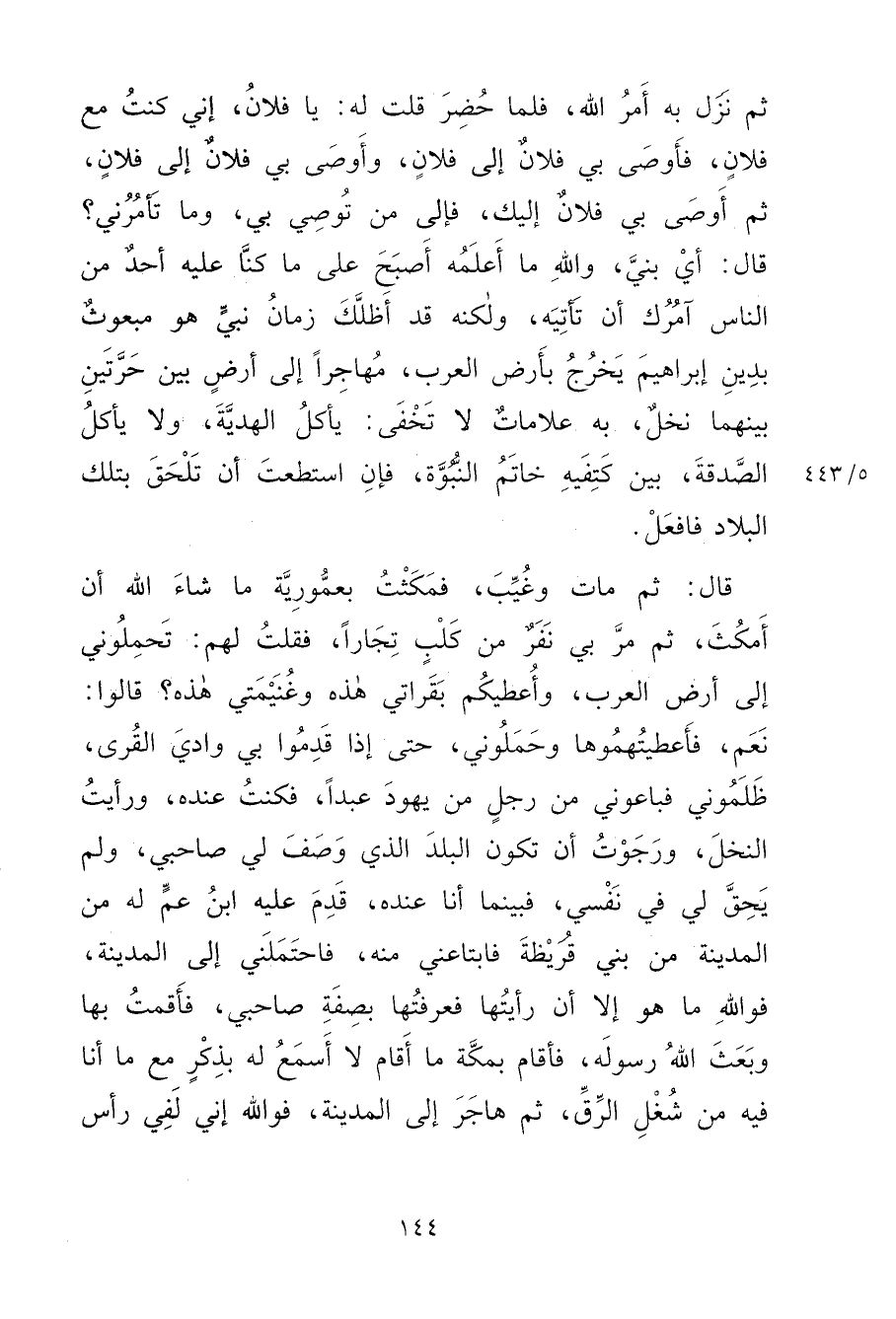 ثُمَّ نَزَلَ بِهِ أَمْرُ اللهِ، فَلَمَّا حَضَرَ قُلْتُ لَهُ: يَا فُلَانُ، إِنِّي كُنْتُ مَعَ فُلَانٍ، فَأَوْصَى بِي فُلَانٌ إِلَى فُلَانٍ، وَأَوْصَى بِي فُلَانٌ إِلَى فُلَانٍ، ثُمَّ أَوْصَى بِي فُلَانٌ إِلَيْكَ، فَإِلَى مَنْ تُوصِي بِي، وَمَا تَأْمُرُنِي؟ قَالَ: أَيْ بُنَيَّ، وَاللهِ مَا أَعْلَمُهُ أَصْبَحَ عَلَى مَا كُنَّا عَلَيْهِ أَحَدٌ مِنَ النَّاسِ آمُرُكَ أَنْ تَأْتِيَهُ، وَلَكِنَّهُ قَدْ أَظَلَّكَ زَمَانُ نَبِيٍّ هُوَ مَبْعُوثٌ بِدِينِ إِبْرَاهِيمَ يَخْرُجُ بِأَرْضِ الْعَرَبِ، مُهَاجِرًا إِلَى أَرْضٍ بَيْنَ حَرَّتَيْنِ بَيْنَهُمَا نَخْلٌ، بِهِ عَلَامَاتٌ لَا تَخْفَى: يَأْكُلُ الْهَدِيَّةَ، وَلَا يَأْكُلُ الصَّدَقَةَ، بَيْنَ كَتِفَيْهِ خَاتَمُ النُّبُوَّةِ، فَإِنْ اسْتَطَعْتَ أَنْ تَلْحَقَ بِتِلْكَ الْبِلَادِ فَافْعَلْ، قَالَ: ثُمَّ مَاتَ وَغَيَّبَ، فَمَكَثْتُ بِعَمُّورِيَّةَ مَا شَاءَ اللهُ أَنْ أَمْكُثَ، ثُمَّ مَرَّ بِي نَفَرٌ مِنْ كَلْبٍ تُجَّارًا، فَقُلْتُ لَهُمْ: تَحْمِلُونِي إِلَى أَرْضِ الْعَرَبِ، وَأُعْطِيكُمْ بَقَرَاتِي هَذِهِ وَغُنَيْمَتِي هَذِهِ؟ قَالُوا: نَعَمْ فَأَعْطَيْتُهُمُوهَا وَحَمَلُونِي، حَتَّى إِذَا قَدِمُوا بِي وَادِي الْقُرَى ظَلَمُونِي فَبَاعُونِي مِنْ رَجُلٍ مِنْ يَهُودَ عَبْدًا، فَكُنْتُ عِنْدَهُ، وَرَأَيْتُ النَّخْلَ، وَرَجَوْتُ أَنْ تَكُونَ الْبَلَدَ الَّذِي وَصَفَ لِي صَاحِبِي، وَلَمْ يَحِقْ لِي فِي نَفْسِي، فَبَيْنَمَا أَنَا عِنْدَهُ، قَدِمَ عَلَيْهِ ابْنُ عَمٍّ لَهُ مِنَ الْمَدِينَةِ مِنْ بَنِي قُرَيْظَةَ فَابْتَاعَنِي مِنْهُ، فَاحْتَمَلَنِي إِلَى الْمَدِينَةِ، فَوَاللهِ مَا هُوَ إِلَّا أَنْ رَأَيْتُهَا فَعَرَفْتُهَا بِصِفَةِ صَاحِبِي، فَأَقَمْتُ بِهَا وَبَعَثَ اللهُ رَسُولَهُ، فَأَقَامَ بِمَكَّةَ مَا أَقَامَ لَا أَسْمَعُ لَهُ بِذِكْرٍ مَعَ مَا أَنَا فِيهِ مِنْ شُغْلِ الرِّقِّ، ثُمَّ هَاجَرَ إِلَى الْمَدِينَةِ، فَوَاللهِ إِنِّي لَفِي رَأْسِ