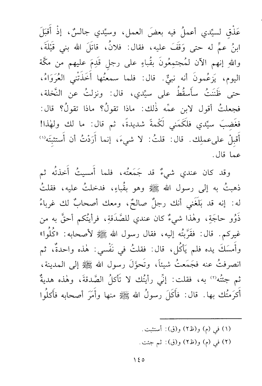 عَذْقٍ لِسَيِّدِي أَعْمَلُ فِيهِ بَعْضَ الْعَمَلِ، وَسَيِّدِي جَالِسٌ، إِذْ أَقْبَلَ ابْنُ عَمٍّ لَهُ حَتَّى وَقَفَ عَلَيْهِ، فَقَالَ: فُلَانُ، قَاتَلَ اللهُ بَنِي قَيْلَةَ، وَاللهِ إِنَّهُمُ الْآنَ لَمُجْتَمِعُونَ بِقُبَاءَ عَلَى رَجُلٍ قَدِمَ عَلَيْهِمْ مِنْ مَكَّةَ الْيَوْمَ، يَزْعُمُونَ أَنَّهُ نَبِيٌّ، قَالَ: فَلَمَّا سَمِعْتُهَا أَخَذَتْنِي الْعُرَوَاءُ، حَتَّى ظَنَنْتُ سَأَسْقُطُ عَلَى سَيِّدِي، قَالَ: وَنَزَلْتُ عَنِ النَّخْلَةِ، فَجَعَلْتُ أَقُولُ لِابْنِ عَمِّهِ ذَلِكَ: مَاذَا تَقُولُ؟ مَاذَا تَقُولُ؟ قَالَ: فَغَضِبَ سَيِّدِي فَلَكَمَنِي لَكْمَةً شَدِيدَةً، ثُمَّ قَالَ: مَا لَكَ وَلِهَذَا أَقْبِلْ عَلَى عَمَلِكَ، قَالَ: قُلْتُ: لَا شَيْءَ، إِنَّمَا أَرَدْتُ أَنْ أَسْتَثْبِتَهُ (١) عَمَّا قَالَ: وَقَدْ كَانَ عِنْدِي شَيْءٌ قَدْ جَمَعْتُهُ، فَلَمَّا أَمْسَيْتُ أَخَذْتُهُ ثُمَّ ذَهَبْتُ إِلَى رَسُولِ اللهِ صَلَّى اللهُ عَلَيْهِ وَسَلَّمَ وَهُوَ بِقُبَاءَ، فَدَخَلْتُ عَلَيْهِ، فَقُلْتُ لَهُ: إِنَّهُ قَدْ بَلَغَنِي أَنَّكَ رَجُلٌ صَالِحٌ، وَمَعَكَ أَصْحَابٌ لَكَ غُرَبَاءُ ذَوُو حَاجَةٍ، وَهَذَا شَيْءٌ كَانَ عِنْدِي لِلصَّدَقَةِ، فَرَأَيْتُكُمْ أَحَقَّ بِهِ مِنْ غَيْرِكُمْ قَالَ: فَقَرَّبْتُهُ إِلَيْهِ، فَقَالَ رَسُولُ اللهِ صَلَّى اللهُ عَلَيْهِ وَسَلَّمَ لِأَصْحَابِهِ: " كُلُوا " وَأَمْسَكَ يَدَهُ فَلَمْ يَأْكُلْ، قَالَ: فَقُلْتُ فِي نَفْسِي: هَذِهِ وَاحِدَةٌ، ثُمَّ انْصَرَفْتُ عَنْهُ فَجَمَعْتُ شَيْئًا، وَتَحَوَّلَ رَسُولُ اللهِ صَلَّى اللهُ عَلَيْهِ وَسَلَّمَ إِلَى الْمَدِينَةِ، ثُمَّ جِئْتُهُ (٢) بِهِ، فَقُلْتُ: إِنِّي رَأَيْتُكَ لَا تَأْكُلُ الصَّدَقَةَ، وَهَذِهِ هَدِيَّةٌ أَكْرَمْتُكَ بِهَا، قَالَ: فَأَكَلَ رَسُولُ اللهِ صَلَّى اللهُ عَلَيْهِ وَسَلَّمَ مِنْهَا وَأَمَرَ أَصْحَابَهُ فَأَكَلُوا