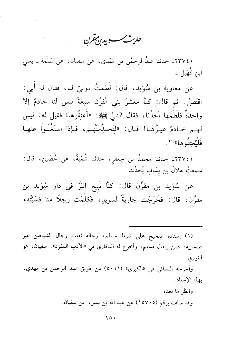 ٢٣٧٤٠ - حَدَّثَنَا عَبْدُ الرَّحْمَنِ بْنُ مَهْدِيٍّ، عَنْ سُفْيَانَ، عَنْ سَلَمَةَ يَعْنِي ابْنَ كُهَيْلٍ، عَنْ مُعَاوِيَةَ بْنِ سُوَيْدٍ، قَالَ: لَطَمْتُ مَوْلًى لَنَا، فَقَالَ لَهُ أَبِي: اقْتَصَّ، ثُمَّ قَالَ: كُنَّا مَعْشَرَ بَنِي مُقَرِّنٍ سَبْعَةً لَيْسَ لَنَا خَادِمٌ إِلَّا وَاحِدَةٌ فَلَطَمَهَا أَحَدُنَا، فَقَالَ النَّبِيُّ صَلَّى اللهُ عَلَيْهِ وَسَلَّمَ: " أَعْتِقُوهَا " فَقِيلَ لَهُ: لَيْسَ لَهُمْ خَادِمٌ غَيْرُهَا قَالَ: " لِتَخْدُمَنَّهُمْ، فَإِذَا اسْتَغْنَوْا عَنْهَا فَلْيُعْتِقُوهَا " (١)