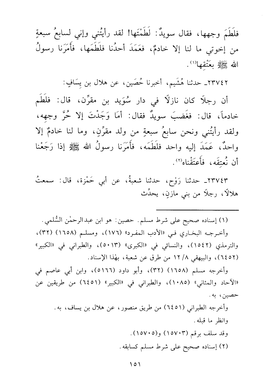 ٢٣٧٤٢ - حَدَّثَنَا هُشَيْمٌ، أَخْبَرَنَا حُصَيْنٌ، عَنْ هِلَالِ بْنِ يِسَافٍ، أَنَّ رَجُلًا كَانَ نَازِلًا فِي دَارِ سُوَيْدِ بْنِ مُقَرِّنٍ، قَالَ: فَلَطَمَ خَادِمًا، قَالَ: فَغَضِبَ سُوَيْدٌ، فَقَالَ: أَمَا وَجَدْتَ إِلَّا حُرَّ وَجْهِهِ، وَلَقَدْ رَأَيْتُنِي، وَنَحْنُ سَابِعُ سَبْعَةٍ مِنْ وَلَدِ مُقَرِّنٍ، وَمَا لَنَا خَادِمٌ إِلَّا وَاحِدٌ، عَمَدَ إِلَيْهِ وَاحِدٌ فَلَطَمَهُ، " فَأَمَرَنَا رَسُولُ اللهِ صَلَّى اللهُ عَلَيْهِ وَسَلَّمَ إِذَا رَجَعْنَا أَنْ نُعْتِقَهُ، فَأَعْتَقْنَاهُ " (٢)