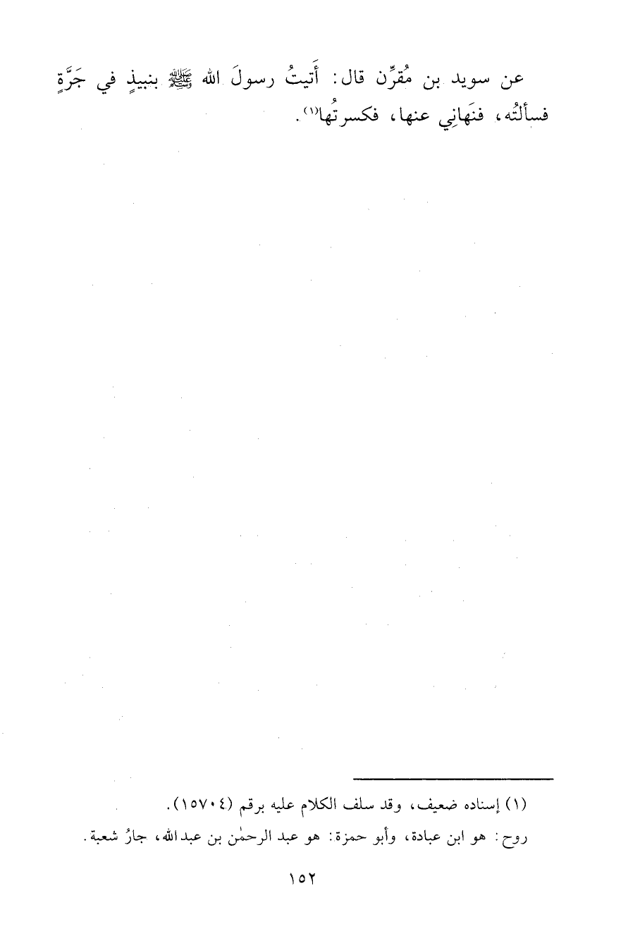 عَنْ سُوَيْدِ بْنِ مُقَرِّنٍ، قَالَ: " أَتَيْتُ رَسُولَ اللهِ صَلَّى اللهُ عَلَيْهِ وَسَلَّمَ بِنَبِيذٍ فِي جَرَّةٍ، فَسَأَلْتُهُ؟ فَنَهَانِي عَنْهَا فَكَسَرْتُهَا " (١)