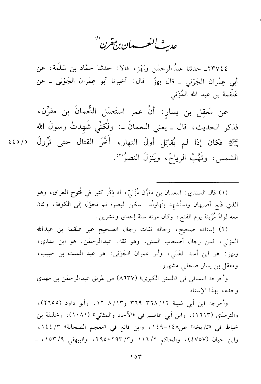 ٢٣٧٤٤ - حَدَّثَنَا عَبْدُ الرَّحْمَنِ، وَبَهْزٌ، قَالَا: حَدَّثَنَا حَمَّادُ بْنُ سَلَمَةَ، عَنْ أَبِي عِمْرَانَ الْجَوْنِيِّ، قَالَ بَهْزٌ: قَالَ أَخْبَرَنَا أَبُو عِمْرَانَ الْجَوْنِيُّ، عَنْ عَلْقَمَةَ بْنِ عَبْدِ اللهِ الْمُزَنِيِّ، عَنْ مَعْقِلِ بْنِ يَسَارٍ: أَنَّ عُمَرَ، اسْتَعْمَلَ النُّعْمَانَ بْنَ مُقَرِّنٍ، فَذَكَرَ الْحَدِيثَ قَالَ:، يَعْنِي النُّعْمَانَ، وَلَكِنِّي " شَهِدْتُ رَسُولَ اللهِ صَلَّى اللهُ عَلَيْهِ وَسَلَّمَ فَكَانَ إِذَا لَمْ يُقَاتِلْ أَوَّلَ النَّهَارِ، أَخَّرَ الْقِتَالَ حَتَّى تَزُولَ الشَّمْسُ، وَتَهُبَّ الرِّيَاحُ، وَيَنْزِلَ النَّصْرُ " (٢)