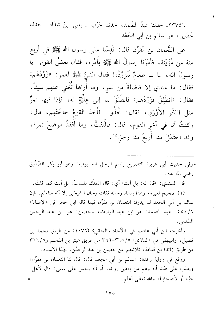 ٢٣٧٤٦ - حَدَّثَنَا عَبْدُ الصَّمَدِ، حَدَّثَنَا حَرْبٌ يَعْنِي ابْنَ شَدَّادٍ، حَدَّثَنَا حُصَيْنٌ، عَنْ سَالِمِ بْنِ أَبِي الْجَعْدِ، عَنِ النُّعْمَانِ بْنِ مُقَرِّنٍ، قَالَ: قَدِمْنَا عَلَى رَسُولِ اللهِ صَلَّى اللهُ عَلَيْهِ وَسَلَّمَ فِي أَرْبَعِ مِائَةٍ مِنْ مُزَيْنَةَ، فَأَمَرَنَا رَسُولُ اللهِ صَلَّى اللهُ عَلَيْهِ وَسَلَّمَ بِأَمْرِهِ، فَقَالَ بَعْضُ الْقَوْمِ: يَا رَسُولَ اللهِ مَا لَنَا طَعَامٌ نَتَزَوَّدُهُ، فَقَالَ النَّبِيُّ صَلَّى اللهُ عَلَيْهِ وَسَلَّمَ لِعُمَرَ: " زَوِّدْهُمْ " فَقَالَ: مَا عِنْدِي إِلَّا فَاضِلَةٌ مِنْ تَمْرٍ، وَمَا أُرَاهَا تُغْنِي عَنْهُمْ شَيْئًا، فَقَالَ: " انْطَلِقْ فَزَوِّدْهُمْ " فَانْطَلَقَ بِنَا إِلَى عُلِّيَّةٍ لَهُ، فَإِذَا فِيهَا تَمْرٌ مِثْلُ الْبَكْرِ الْأَوْرَقِ فَقَالَ: خُذُوا فَأَخَذَ الْقَوْمُ حَاجَتَهُمْ، قَالَ: وَكُنْتُ أَنَا فِي آخِرِ الْقَوْمِ، قَالَ: فَالْتَفَتُّ وَمَا أَفْقِدُ مَوْضِعَ تَمْرَةٍ وَقَدْ احْتَمَلَ مِنْهُ أَرْبَعُ مِائَةِ رَجُلٍ (١)