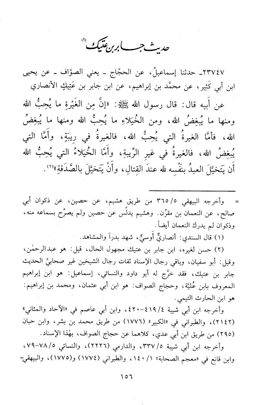 ٢٣٧٤٧ - حَدَّثَنَا إِسْمَاعِيلُ، عَنِ الْحَجَّاجِ يَعْنِي الصَّوَّافَ، عَنْ يَحْيَى بْنِ أَبِي كَثِيرٍ، عَنْ مُحَمَّدِ بْنِ إِبْرَاهِيمَ، عَنْ ابْنِ جَابِرِ بْنِ عَتِيكٍ الْأَنْصَارِيِّ، عَنْ أَبِيه، قَالَ: قَالَ رَسُولُ اللهِ صَلَّى اللهُ عَلَيْهِ وَسَلَّمَ: " إِنَّ مِنَ الْغَيْرَةِ مَا يُحِبُّ اللهُ، وَمِنْهَا مَا يُبْغِضُ اللهُ، وَمِنَ الْخُيَلَاءِ مَا يُحِبُّ اللهُ، وَمِنْهَا مَا يُبْغِضُ اللهُ، فَأَمَّا الْغَيْرَةُ الَّتِي يُحِبُّ اللهُ، فَالْغَيْرَةُ فِي رِيبَةٍ، وَأَمَّا الَّتِي يُبْغِضُ اللهُ، فَالْغَيْرَةُ فِي غَيْرِ الرِّيبَةِ، وَأَمَّا الْخُيَلَاءُ الَّتِي يُحِبُّ اللهُ أَنْ يَتَخَيَّلَ الْعَبْدُ بِنَفْسِهِ لِلَّهِ عِنْدَ الْقِتَالِ، وَأَنْ يَتَخَيَّلَ بِالصَّدَقَةِ " (٢)