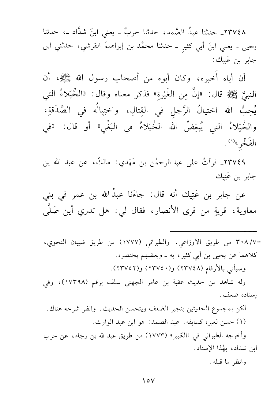 ٢٣٧٤٨ - حَدَّثَنَا عَبْدُ الصَّمَدِ، حَدَّثَنَا حَرْبٌ يَعْنِي ابْنَ شَدَّادٍ، حَدَّثَنَا يَحْيَى يَعْنِي ابْنَ أَبِي كَثِيرٍ، حَدَّثَنَا مُحَمَّدُ بْنُ إِبْرَاهِيمَ الْقُرَشِيُّ، حَدَّثَنَي ابْنُ جَابِرِ بْنِ عَتِيكٍ، أَنَّ أَبَاهُ أَخْبَرَهُ، وَكَانَ أَبُوهُ مِنْ أَصْحَابِ رَسُولِ اللهِ صَلَّى اللهُ عَلَيْهِ وَسَلَّمَ أَنَّ النَّبِيَّ صَلَّى اللهُ عَلَيْهِ وَسَلَّمَ قَالَ: " إِنَّ مِنَ الْغَيْرَةِ " فَذَكَرَ مَعْنَاهُ وَقَالَ: " الْخُيَلَاءُ الَّتِي يُحِبُّ اللهُ اخْتِيَالُ الرَّجُلِ فِي الْقِتَالِ، وَاخْتِيَالُهُ فِي الصَّدَقَةِ، وَالْخُيَلَاءُ الَّتِي يُبْغِضُ اللهُ الْخُيَلَاءُ فِي الْبَغْيِ " أَوْ قَالَ: " فِي الْفَخْرِ " (١)