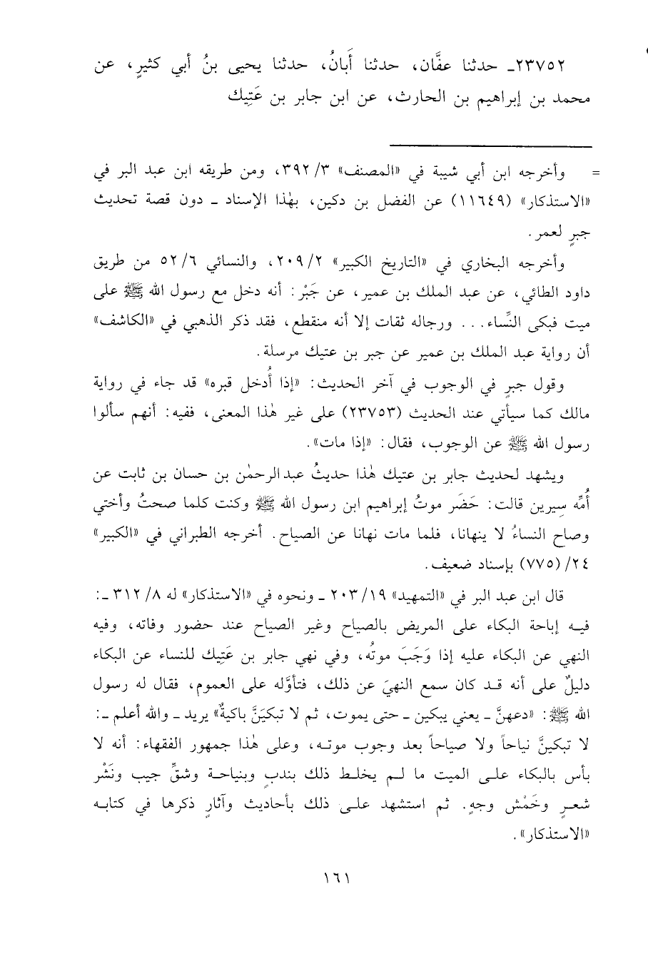 ويشهد لحديث جابر بن عتيك هذا حديثُ عبد الرحمن بن حسان بن ثابت عن أُمِّه سِيرين قالت: حَضَر موتُ إبراهيم ابن رسول الله صَلَّى اللهُ عَلَيْهِ وَسَلَّمَ وكنت كلما صحتُ وأختي وصاح النساءُ لا ينهانا، فلما مات نهانا عن الصياح. أخرجه الطبراني في "الكبير" ٢٤/ (٧٧٥) بإسناد ضعيف.