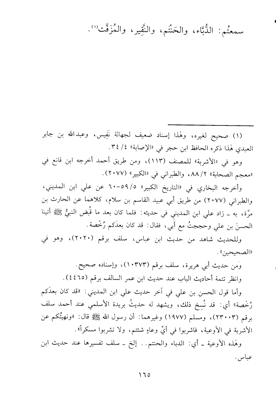 وأما قول الحسن بن علي في آخر حديث علي ابن المديني: "قد كان بعدَكم رُخْصة" أي: قد نُسِخ ذلك، ويشهد له حديثُ بريدة الأسلمي عند أحمد سلف برقم (٢٣٠٠٣) ، ومسلم (١٩٧٧) وغيرهما: أن رسول الله صَلَّى اللهُ عَلَيْهِ وَسَلَّمَ قال: "ونهيتُكم عن الأشربة في الأوعية، فاشربوا في أي وعاءٍ شئتم، ولا تشربوا مسكراً".