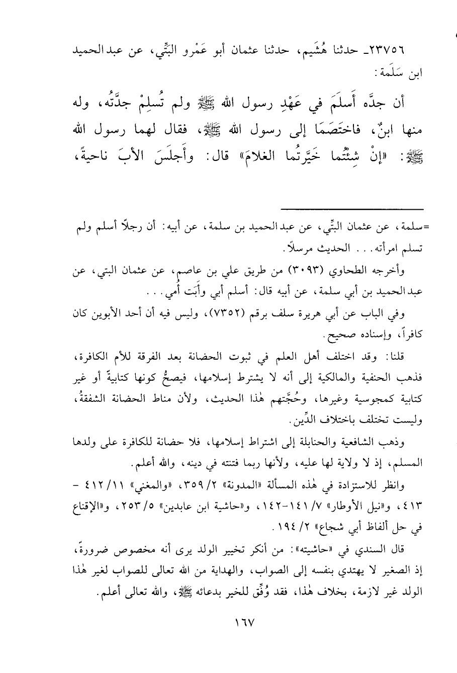 ٢٣٧٥٦ - حَدَّثَنَا هُشَيْمٌ، حَدَّثَنَا عُثْمَانُ أَبُو عَمْرٍو الْبَتِّيِّ، عَنْ عَبْدِ الْحَمِيدِ بْنِ سَلَمَةَ، أَنَّ جَدَّهُ أَسْلَمَ فِي عَهْدِ رَسُولِ اللهِ صَلَّى اللهُ عَلَيْهِ وَسَلَّمَ وَلَمْ تُسْلِمْ جَدَّتُهُ، وَلَهُ مِنْهَا ابْنٌ، فَاخْتَصَمَا إِلَى رَسُولِ اللهِ صَلَّى اللهُ عَلَيْهِ وَسَلَّمَ، فَقَالَ لَهُمَا رَسُولُ اللهِ صَلَّى اللهُ عَلَيْهِ وَسَلَّمَ: " إِنْ شِئْتُمَا خَيَّرْتُمَا الْغُلَامَ " قَالَ: وَأَجْلَسَ الْأَبَ نَاحِيَةً،