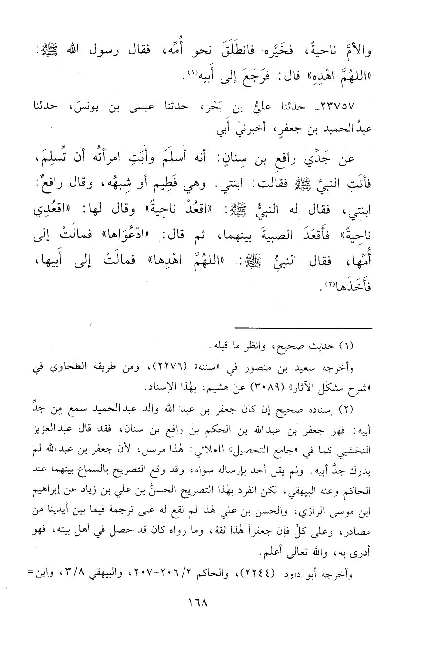 ٢٣٧٥٧ - حَدَّثَنَا عَلِيُّ بْنُ بَحْرٍ، حَدَّثَنَا عِيسَى بْنُ يُونُسَ، حَدَّثَنَا عَبْدُ الْحَمِيدِ بْنُ جَعْفَرٍ، أَخْبَرَنِي أَبِي، عَنْ جَدِّي، رَافِعِ بْنِ سِنَانٍ أَنَّهُ أَسْلَمَ وَأَبَتْ امْرَأَتُهُ أَنْ تُسْلِمَ، فَأَتَتِ النَّبِيَّ صَلَّى اللهُ عَلَيْهِ وَسَلَّمَ فَقَالَتْ: ابْنَتِي، وَهِيَ فَطِيمٌ أَوْ شَبَهُهُ، وَقَالَ رَافِعٌ: ابْنَتِي، فَقَالَ لَهُ النَّبِيُّ صَلَّى اللهُ عَلَيْهِ وَسَلَّمَ: " اقْعُدْ نَاحِيَةً " وَقَالَ لَهَا: " اقْعُدِي نَاحِيَةً " فَأَقْعَدَ الصَّبِيَّةَ بَيْنَهُمَا، ثُمَّ قَالَ: " ادْعُوَاهَا "، فَمَالَتْ إِلَى أُمِّهَا، فَقَالَ النَّبِيُّ صَلَّى اللهُ عَلَيْهِ وَسَلَّمَ: " اللهُمَّ اهْدِهَا " فَمَالَتْ إِلَى أَبِيهَا فَأَخَذَهَا (٢)