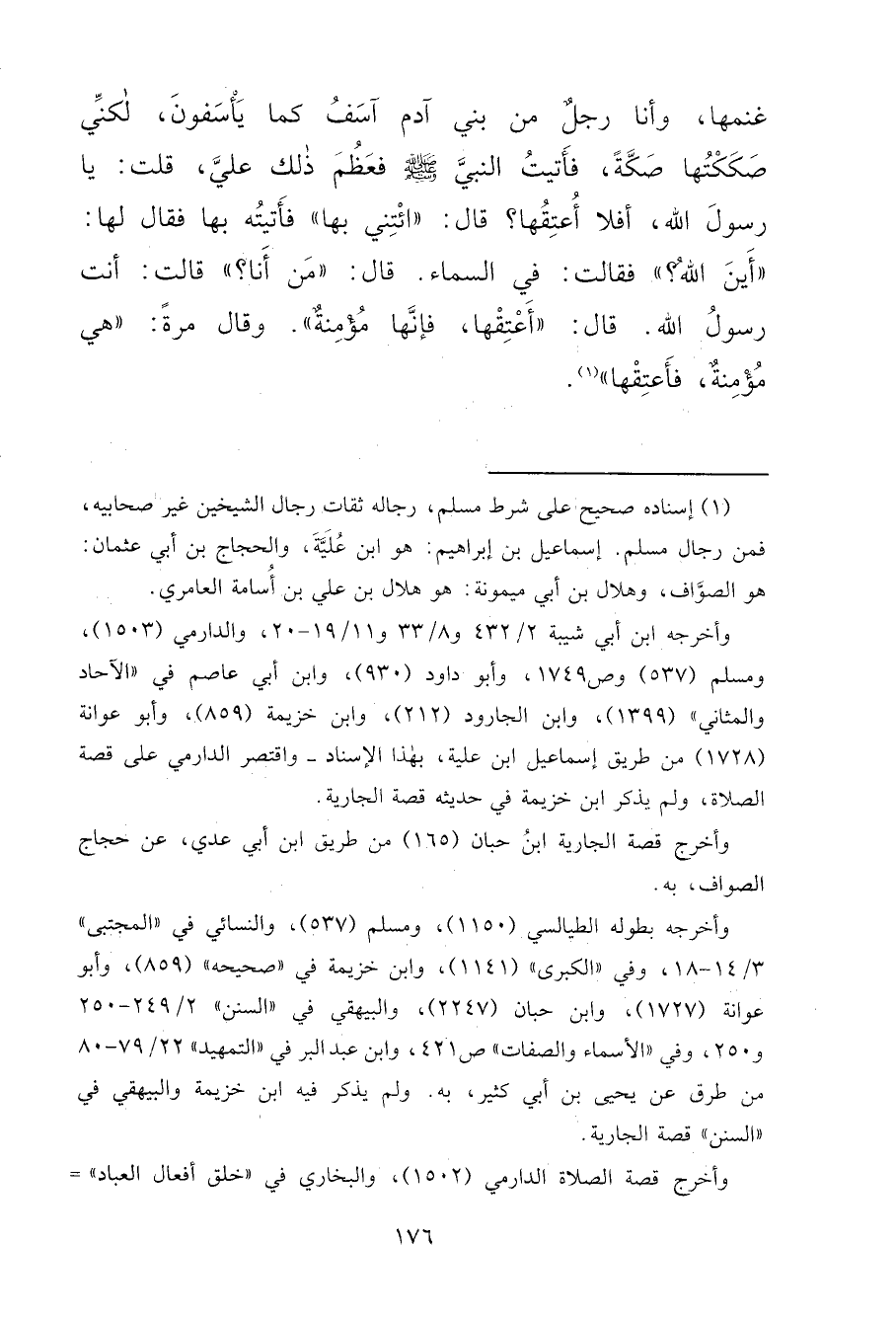 غَنَمِهَا، وَأَنَا رَجُلٌ مِنْ بَنِي آدَمَ آسَفُ كَمَا يَأْسَفُونَ، لَكِنِّي صَكَكْتُهَا صَكَّةً، فَأَتَيْتُ النَّبِيَّ صَلَّى اللهُ عَلَيْهِ وَسَلَّمَ فَعَظَّمَ ذَلِكَ عَلَيَّ، قُلْتُ: يَا رَسُولَ اللهِ، أَفَلَا أُعْتِقُهَا؟ قَالَ: " ائْتِنِي بِهَا " فَأَتَيْتُهُ بِهَا فَقَالَ لَهَا: " أَيْنَ اللهُ؟ " فَقَالَتْ: فِي السَّمَاءِ، قَالَ: " مَنْ أَنَا؟ " قَالَتْ: أَنْتَ رَسُولُ اللهِ، قَالَ: " أَعْتِقْهَا، فَإِنَّهَا مُؤْمِنَةٌ " وَقَالَ مَرَّةً: " هِيَ مُؤْمِنَةٌ، فَأَعْتِقْهَا " (١)