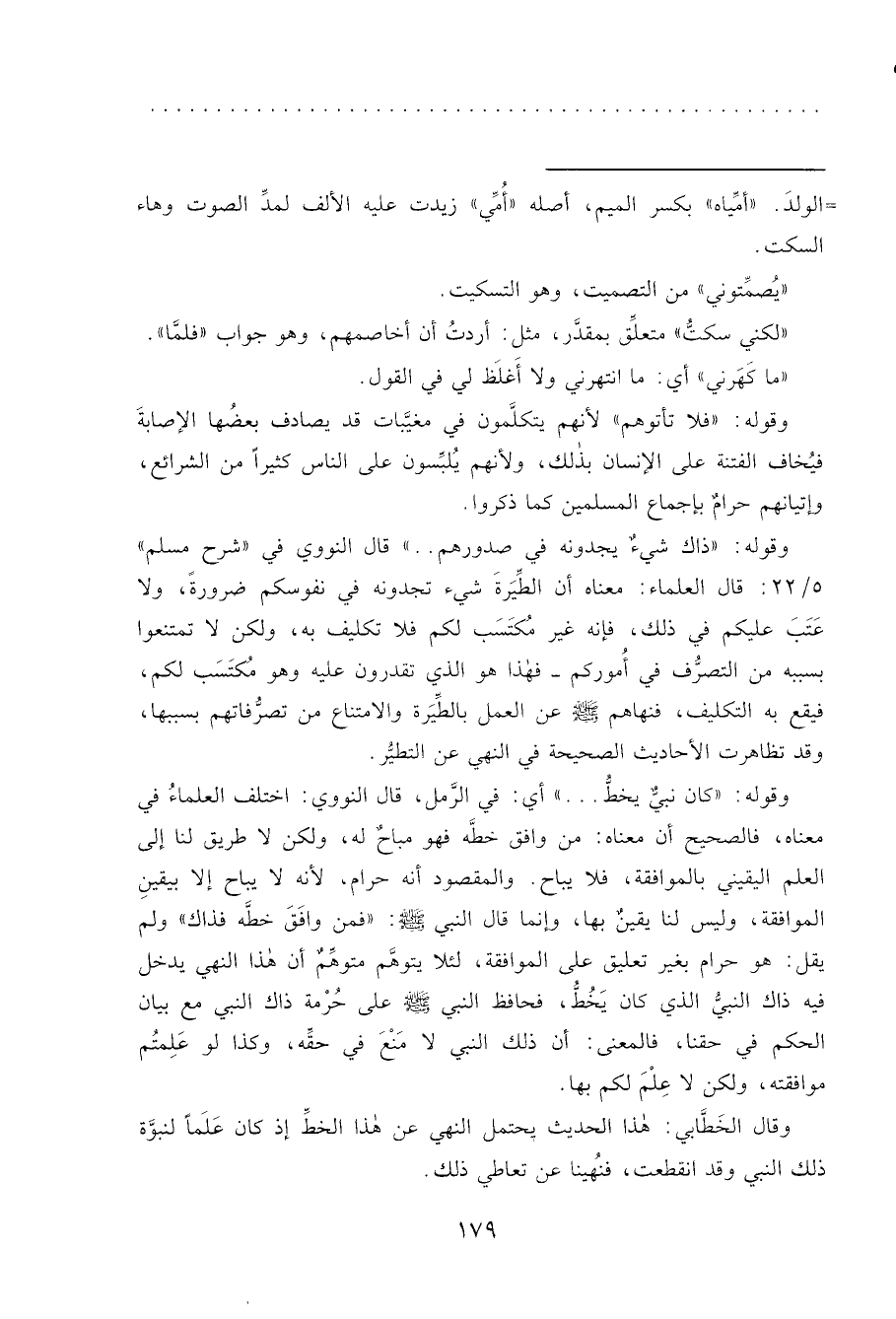 وقوله: "كان نبيٌّ يخطُّ ... " أي: في الرَّمل، قال النووي: اختلف العلماءُ في معناه، فالصحيح أن معناه: من وافق خطَّه فهو مباحٌ له، ولكن لا طريق لنا إلى العلم اليقيني بالموافقة، فلا يباح. والمقصود أنه حرام، لأنه لا يباح إلا بيقينِ الموافقة، وليس لنا يقينٌ بها، وإنما قال النبي صَلَّى اللهُ عَلَيْهِ وَسَلَّمَ: "فمن وافَقَ خطَّه فذاك" ولم يقل: هو حرام بغير تعليق على الموافقة، لئلا يتوهَّم متوهِّمٌ أن هذا النهي يدخل