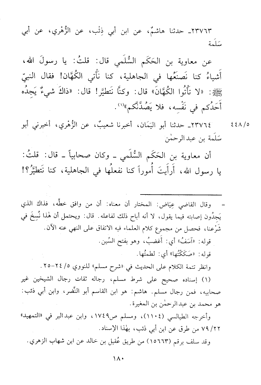 ٢٣٧٦٣ - حَدَّثَنَا هَاشِمٌ، عَنِ ابْنِ أَبِي ذِئْبٍ، عَنِ الزُّهْرِيِّ، عَنْ أَبِي سَلَمَةَ، عَنْ مُعَاوِيَةَ بْنِ الْحَكَمِ السُّلَمِيِّ، قَالَ: قُلْتُ: يَا رَسُولَ اللهِ أَشْيَاءُ كُنَّا نَصْنَعُهَا فِي الْجَاهِلِيَّةِ كُنَّا نَأْتِي الْكُهَّانَ فَقَالَ النَّبِيُّ صَلَّى اللهُ عَلَيْهِ وَسَلَّمَ: " لَا تَأْتُوا الْكُهَّانَ " قَالَ: وَكُنَّا نَتَطَيَّرُ قَالَ: " ذَاكَ شَيْءٌ يَجِدُهُ أَحَدُكُمْ فِي نَفْسِهِ فَلَا يَصُدَّنَّكُمْ " (١)