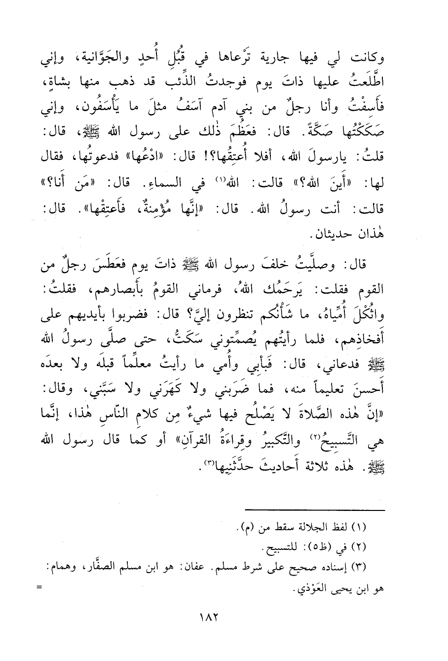 وَكَانَتْ لِي فِيهَا جَارِيَةٌ تَرْعَاهَا فِي قِبَلِ أُحُدٍ والْجَوَّانِيَّةِ وإني اطَّلَعْتُ عَلَيْهَا ذَاتَ يَوْمٍ، فَوَجَدْتُ الذِّئْبَ قَدْ ذَهَبَ مِنْهَا بِشَاةٍ، فَأَسِفْتُ وَأَنَا رَجُلٌ مِنْ بَنِي آدَمَ آسَفُ مِثْلَ مَا يَأْسَفُونَ، وَإِنِّي صَكَكْتُهَا صَكَّةً، قَالَ: فَعَظُمَ ذَلِكَ عَلَى رَسُولِ اللهِ صَلَّى اللهُ عَلَيْهِ وَسَلَّمَ، قَالَ: قُلْتُ: يَا رَسُولَ اللهِ، أَفَلَا أُعْتِقُهَا؟ قَالَ: " ادْعُهَا " فَدَعَوْتُهَا، فَقَالَ لَهَا: " أَيْنَ اللهُ؟ " قَالَتْ: اللهُ (١) فِي السَّمَاءِ قَالَ: " مَنْ أَنَا؟ " قَالَتْ: أَنْتَ رَسُولُ اللهِ قَالَ: " إِنَّهَا مُؤْمِنَةٌ فَأَعْتِقْهَا " قَالَ: هَذَانِ حَدِيثَانِ قَالَ: وَصَلَّيْتُ خَلْفَ رَسُولِ اللهِ صَلَّى اللهُ عَلَيْهِ وَسَلَّمَ ذَاتَ يَوْمٍ فَعَطَسَ رَجُلٌ مِنَ الْقَوْمِ فَقُلْتُ: يَرْحَمُكَ اللهُ، فَرَمَانِي الْقَوْمُ بِأَبْصَارِهِمْ، فَقُلْتُ: وَاثُكْلَ أُمِّيَاهْ، مَا شَأْنُكُمْ تَنْظُرُونَ إِلَيَّ؟ قَالَ: فَضَرَبُوا بِأَيْدِيهِمْ عَلَى أَفْخَاذِهِمْ، فَلَمَّا رَأَيْتُهُمْ يُصْمِتُونِي سَكَتُّ، حَتَّى صَلَّى رَسُولُ اللهِ صَلَّى اللهُ عَلَيْهِ وَسَلَّمَ فَدَعَانِي، قَالَ: فَبِأَبِي وَأُمِّي مَا رَأَيْتُ مُعَلِّمًا قَبْلَهُ وَلَا بَعْدَهُ أَحْسَنَ تَعْلِيمًا مِنْهُ، فَمَا ضَرَبَنِي وَلَا كَهَرَنِي وَلَا سَبَّنِي، وَقَالَ: " إِنَّ هَذِهِ الصَّلَاةَ لَا يَصْلُحُ فِيهَا شَيْءٌ مِنْ كَلَامِ النَّاسِ هَذَا، إِنَّمَا هِيَ التَّسْبِيحُ (٢) وَالتَّكْبِيرُ وَقِرَاءَةُ الْقُرْآنِ " أَوْ كَمَا قَالَ رَسُولُ اللهِ صَلَّى اللهُ عَلَيْهِ وَسَلَّمَ هَذِهِ ثَلَاثَةُ أَحَادِيثَ حَدَّثَنِيهَا (٣)