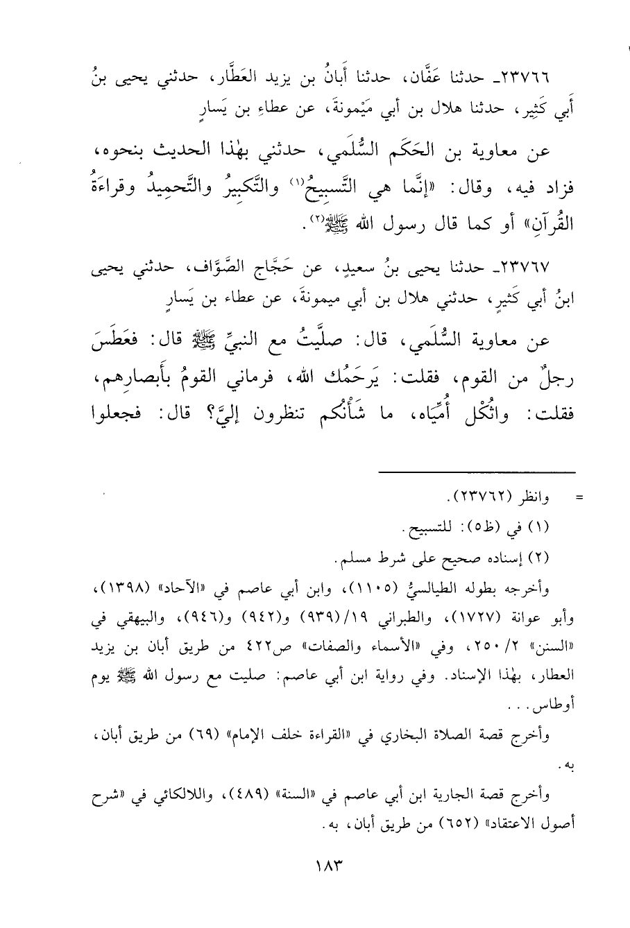 ٢٣٧٦٦ - حَدَّثَنَا عَفَّانُ، حَدَّثَنَا أَبَانُ بْنُ يَزِيدَ الْعَطَّارُ، حَدَّثَنَي يَحْيَى بْنُ أَبِي كَثِيرٍ، حَدَّثَنَا هِلَالُ بْنُ أَبِي مَيْمُونَةَ، عَنْ عَطَاءِ بْنِ يَسَارٍ، عَنْ مُعَاوِيةَ بْنِ الْحَكَمِ السُّلَمِيِّ، حَدَّثَنَي بِهَذَا الْحَدِيثِ بِنَحْوِهِ فَزَادَ فِيهِ، وَقَالَ: " إِنَّمَا هِيَ التَّسْبِيحُ (١) وَالتَّكْبِيرُ وَالتَّحْمِيدُ وَقِرَاءَةُ الْقُرْآنِ " أَوْ كَمَا قَالَ رَسُولُ اللهِ صَلَّى اللهُ عَلَيْهِ وَسَلَّمَ (٢)