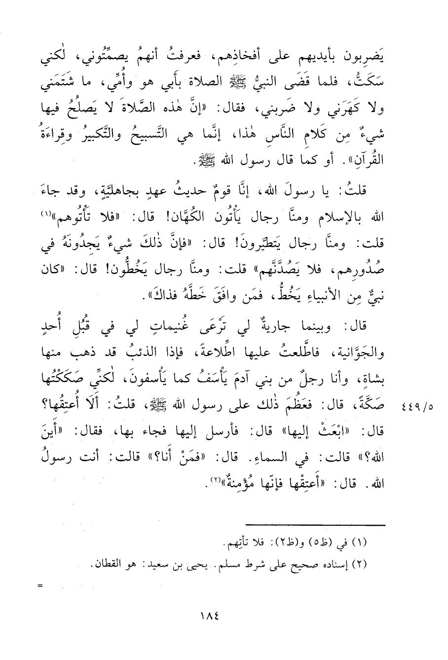 يَضْرِبُونَ بِأَيْدِيهِمْ عَلَى أَفْخَاذِهِمْ، فَعَرَفْتُ أَنَّهُمْ يُصْمِتُونِي، لَكِنِّي سَكَتُّ، فَلَمَّا قَضَى النَّبِيُّ صَلَّى اللهُ عَلَيْهِ وَسَلَّمَ الصَّلَاةَ بِأَبِي هُوَ وَأُمِّي، مَا شَتَمَنِي وَلَا كَهَرَنِي وَلَا ضَرَبَنِي، فَقَالَ: " إِنَّ هَذِهِ الصَّلَاةَ لَا يَصْلُحُ فِيهَا شَيْءٌ مِنْ كَلَامِ النَّاسِ هَذَا، إِنَّمَا هِيَ التَّسْبِيحُ وَالتَّكْبِيرُ وَقِرَاءَةُ الْقُرْآنِ " أَوْ كَمَا قَالَ رَسُولُ اللهِ صَلَّى اللهُ عَلَيْهِ وَسَلَّمَ