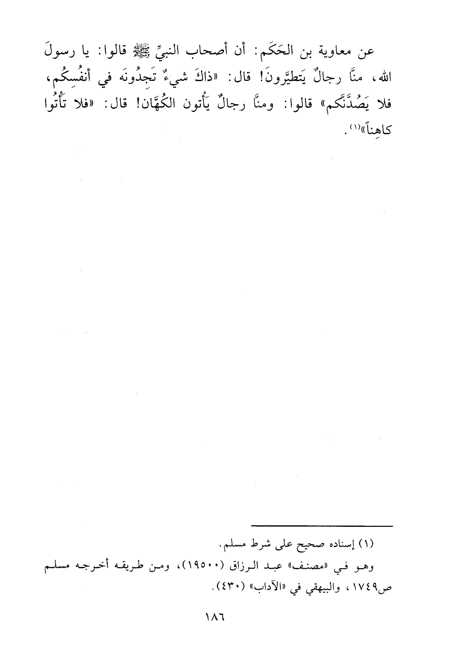 عَنْ مُعَاوِيَةَ بْنِ الْحَكَمِ، أَنَّ أَصْحَابَ النَّبِيِّ صَلَّى اللهُ عَلَيْهِ وَسَلَّمَ قَالُوا: يَا رَسُولَ اللهِ، مِنَّا رِجَالٌ يَتَطَيَّرُونَ قَالَ: " ذَاكَ شَيْءٌ تَجِدُونَهُ فِي أَنْفُسِكُمْ فَلَا يَصُدَّنَّكُمْ " قَالُوا: وَمِنَّا رِجَالٌ يَأْتُونَ الْكُهَّانَ، قَالَ: " فَلَا تَأْتُوا كَاهِنًا " (١)