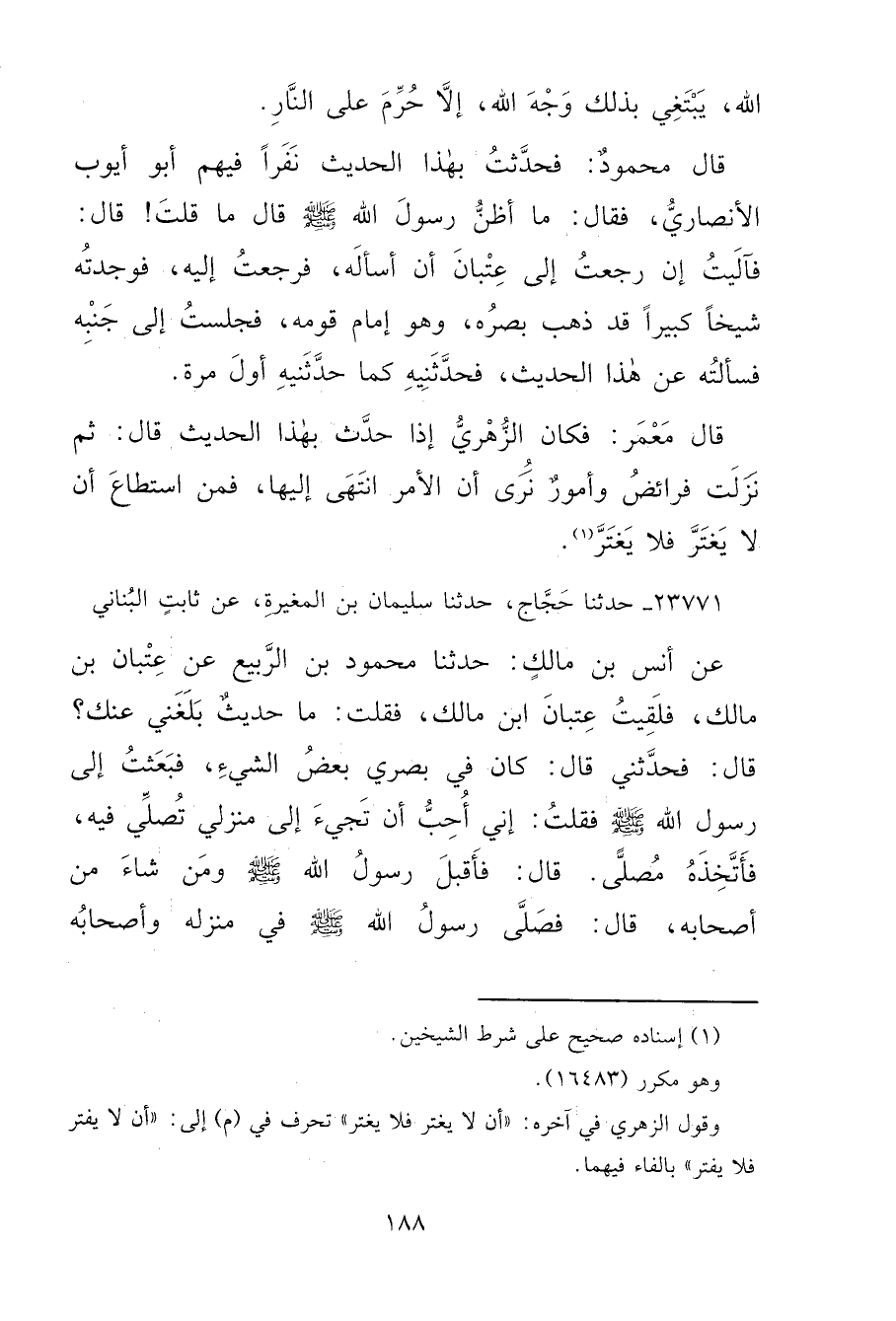 اللهُ يَبْتَغِي بِذَلِكَ وَجْهَ اللهِ إِلَّا حُرِّمَ عَلَى النَّارِ " قَالَ مَحْمُودٌ: فَحَدَّثْتُ بِهَذَا الْحَدِيثِ نَفَرًا فِيهِمْ أَبُو أَيُّوبَ الْأَنْصَارِيُّ فَقَالَ: مَا أَظُنُّ رَسُولَ اللهِ صَلَّى اللهُ عَلَيْهِ وَسَلَّمَ قَالَ مَا قُلْتَ قَالَ: فَآلَيْتُ إِنْ رَجَعْتُ إِلَى عِتْبَانَ أَنْ أَسْأَلَهُ فَرَجَعْتُ إِلَيْهِ فَوَجَدْتُهُ شَيْخًا كَبِيرًا قَدْ ذَهَبَ بَصَرُهُ وَهُوَ إِمَامُ قَوْمِهِ، فَجَلَسْتُ إِلَى جَنْبِهِ، فَسَأَلْتُهُ عَنْ هَذَا الْحَدِيثِ فَحَدَّثَنِيهِ كَمَا حَدَّثَنِيهِ أَوَّلَ مَرَّةٍ. قَالَ مَعْمَرٌ: فَكَانَ الزُّهْرِيُّ إِذَا حَدَّثَ بِهَذَا الْحَدِيثِ قَالَ: " ثُمَّ نَزَلَتْ فَرَائِضُ وَأُمُورٌ نَرَى أَنَّ الْأَمْرَ انْتَهَى إِلَيْهَا فَمَنْ اسْتَطَاعَ أَنْ لَا يَغْتَرَّ فَلَا يَغْتَرَّ " (١)
