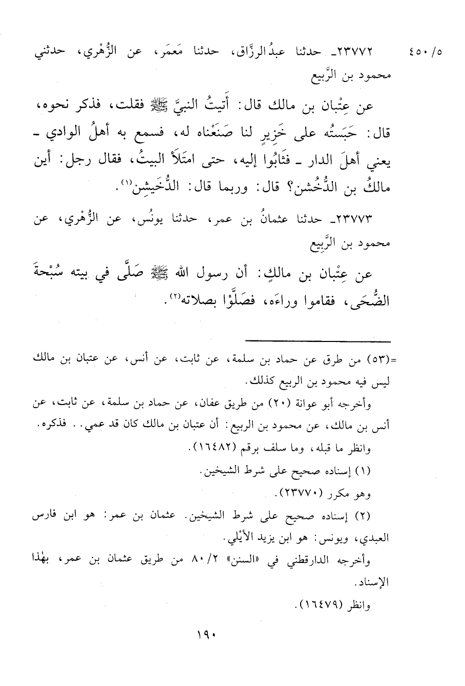 ٢٣٧٧٢ - حَدَّثَنَا عَبْدُ الرَّزَّاقِ، حَدَّثَنَا مَعْمَرٌ، عَنِ الزُّهْرِيِّ، حَدَّثَنَي مَحْمُودُ بْنُ الرَّبِيعِ، عَنْ عِتْبَانَ بْنِ مَالِكٍ، قَالَ: أَتَيْتُ النَّبِيَّ صَلَّى اللهُ عَلَيْهِ وَسَلَّمَ فَقُلْتُ، فَذَكَرَ نَحْوَهُ قَالَ: حَبَسْتُهُ عَلَى خَزِيرٍ لَنَا صَنَعْنَاهُ لَهُ، فَسَمِعَ بِهِ أَهْلُ الْوَادِي، يَعْنِي أَهْلَ الدَّارِ، فَثَابُوا إِلَيْهِ، حَتَّى امْتَلَأَ الْبَيْتُ، فَقَالَ رَجُلٌ: أَيْنَ مَالِكُ بْنُ الدُّخْشُنِ؟ قَالَ: وَرُبَّمَا قَالَ: الدُّخَيْشِنِ (١)